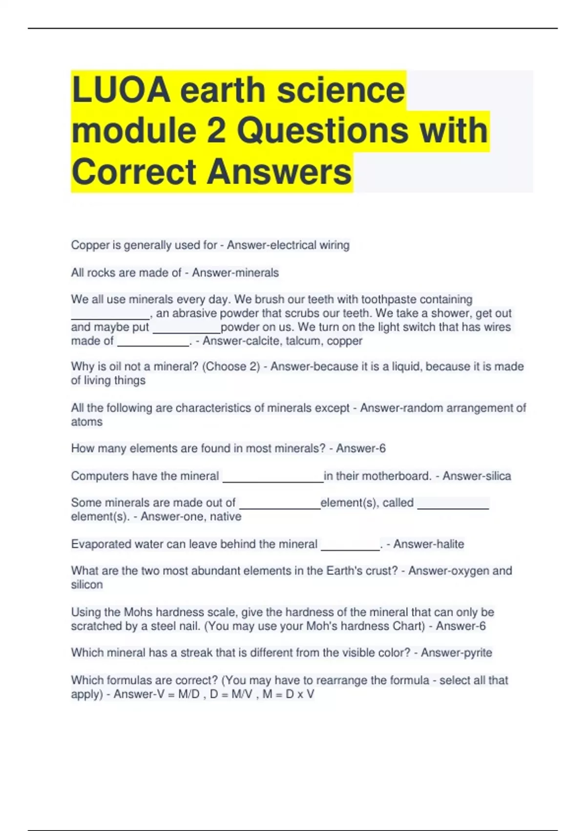 LUOA earth science module 2 Questions with Correct Answers Copper is generally used for - Answer-electrical wiring All rocks are made of - Answer-minerals We all use minerals every day. We brush our teeth with toothpaste containing made of . - Answer-calcite, talcum, copper Why is oil not a mineral? (Choose 2) - Answer-because it is a liquid, because it is made of living things All the following are characteristics of minerals except - Answer-random arrangement of atoms How many elements are found in most minerals? - Answer-6 Computers have the mineral in their motherboard. - Answer-silica Some minerals are made out of element(s), called element(s). - Answer-one, native Evaporated water can leave behind the mineral . - Answer-halite What are the two most abundant elements in the Earth's crust? - Answer-oxygen and silicon