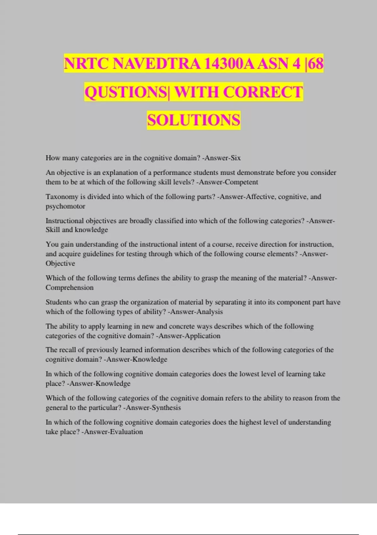 NRTC NAVEDTRA 14300A ASN 4 |68 QUSTIONS| WITH CORRECT SOLUTIONS How many categories are in the cognitive domain? -Answer-Six An objective is an explanation of a performance students must demonstrate before you consider them to be at which of the following skill levels? -Answer-Competent Taxonomy is divided into which of the following parts? -Answer-Affective, cognitive, and psychomotor Instructional objectives are broadly classified into which of the following categories? -Answer- Skill and knowledge You gain understanding of the instructional intent of a course, receive direction for instruction, and acquire guidelines for testing through which of the following course elements? -Answer- Objective Which of the following terms defines the ability to grasp the meaning of the material? -Answer- Comprehension Students who can grasp the organization of material by separating it into its component part have which of the following types of ability? -Answer-Analysis The ability to apply learning in new and concrete ways describes which of the following categories of the cognitive domain? -Answer-Application The recall of previously learned information describes which of the following categories of the cognitive domain? -Answer-Knowledge In which of the following cognitive domain categories does the lowest level of learning take place? -Answer-Knowledge Which of the following categories of the cognitive domain refers to the ability to reason from the general to the particular? -Answer-Synthesis In which of the following cognitive domain categories does the highest level of understanding take place? -Answer-Evaluation In what domain are learning outcomes associated with emotions, attitudes, and feelings? - Answer-Affective Which of the following psychomotor domain levels involves the early stages of learning a complex skill? -Answer-Guided Response Transfer learning is associated with which of the following categories of the psychomotor domain? -Answer-Adaptation At which level within the psychomotor domain should you expect students to demonstrate a high degree of proficiency? -Answer-Complex overt response What element of the psychomotor domain refers to a student's ability for new and creative performance after having developed a skill? -Answer-Origination How many elements does a learning objective have? -Answer-Three The behavior element defines what the learner should be able to do as an outcome of training. It may also include which of the following factors? -Answer-Application of knowledge Which of the following learning objective elements specifies the criteria each student's performance must meet? -Answer-Standard Which of the following learning objective elements defines the degree of interaction with the training environment? -Answer-Condition Knowledge and skills that support a terminal objective are contained in which of the following types of learning objectives? -Answer-Enabling What learning objective serves as a guide for the instructor to use in measuring student performance? -Answer-Terminal In addition to mental and physical skills; learning objectives in Navy training courses normally fall into which of the following categories? -Answer-Knowledg
