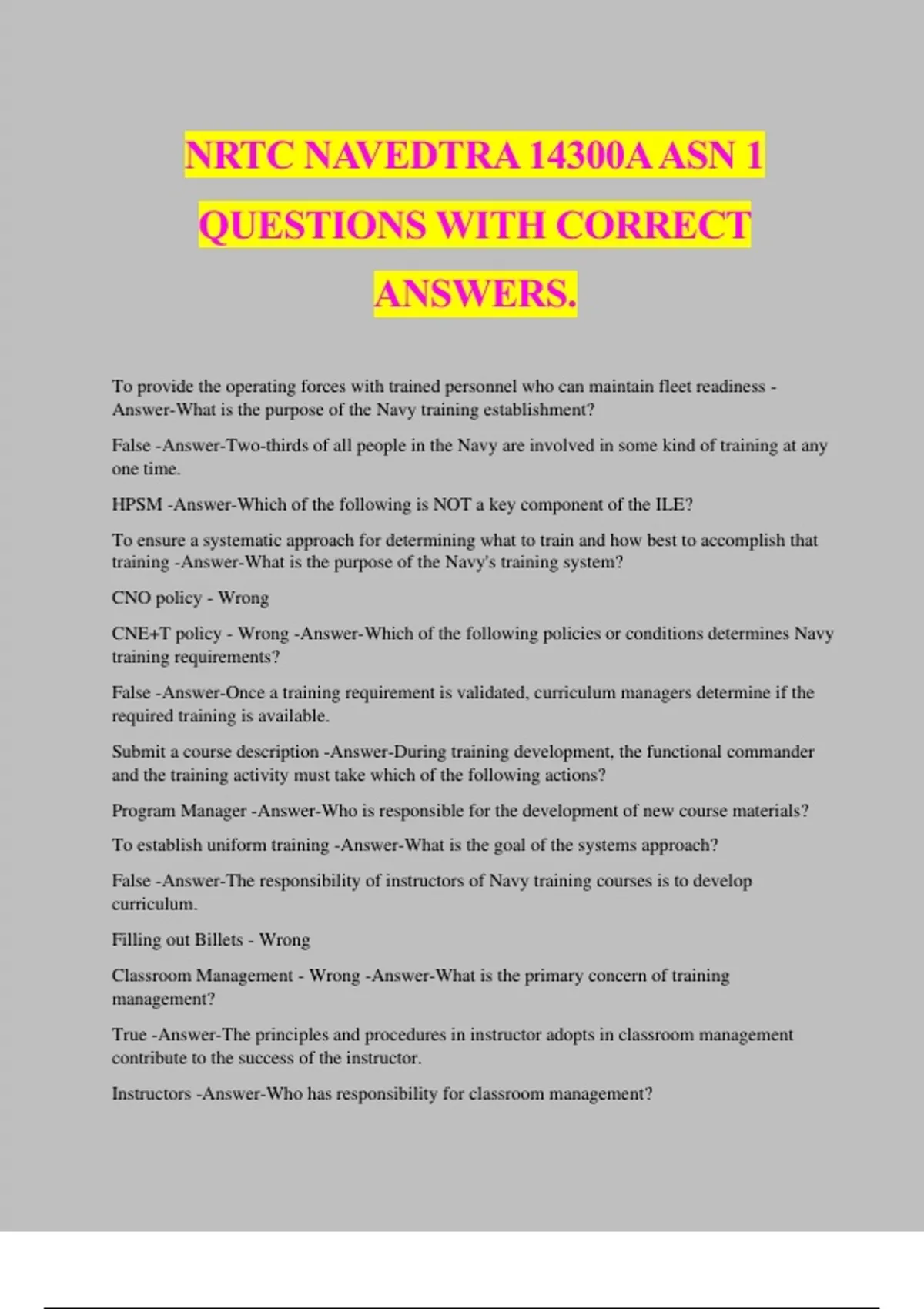 NRTC NAVEDTRA 14300A ASN 1 QUESTIONS WITH CORRECT ANSWERS. To provide the operating forces with trained personnel who can maintain fleet readiness - Answer-What is the purpose of the Navy training establishment? False -Answer-Two-thirds of all people in the Navy are involved in some kind of training at any one time. HPSM -Answer-Which of the following is NOT a key component of the ILE? To ensure a systematic approach for determining what to train and how best to accomplish that training -Answer-What is the purpose of the Navy's training system? CNO policy - Wrong CNE+T policy - Wrong -Answer-Which of the following policies or conditions determines Navy training requirements? False -Answer-Once a training requirement is validated, curriculum managers determine if the required training is available. Submit a course description -Answer-During training development, the functional commander and the training activity must take which of the following actions? Program Manager -Answer-Who is responsible for the development of new course materials? To establish uniform training -Answer-What is the goal of the systems approach? False -Answer-The responsibility of instructors of Navy training courses is to develop curriculum. Filling out Billets - Wrong Classroom Management - Wrong -Answer-What is the primary concern of training management? True -Answer-The principles and procedures in instructor adopts in classroom management contribute to the success of the instructor. Instructors -Answer-Who has responsibility for classroom management? All members of the command -Answer-Who is responsible for the evaluation of training? Instruction and course - Wrong Feedback and Evaluation - Wrong -Answer-Training evaluation is divided into which of the following categories? Safety programs - Wrong Attrition and setback data - Wrong -Answer-Which of the following elements is NOT part of the internal evaluation of a course of instruction? Training manager - Wrong Student - Wrong -Answer-In the training chain, which of the following people is the most essential link? False -Answer-The Navy training system is a relatively simple system Correspondence -Answer-Which o