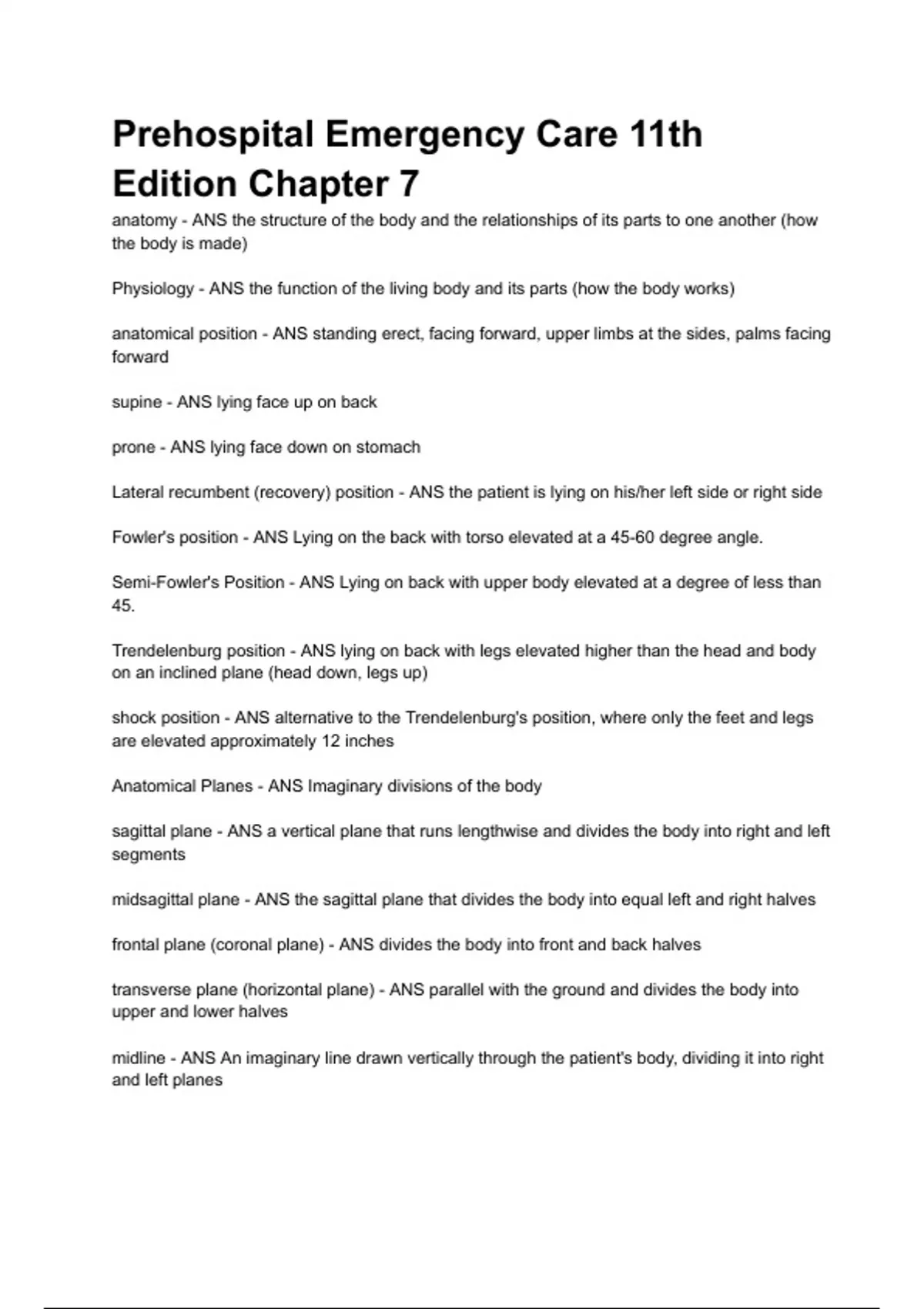 Prehospital Emergency Care 11th Edition Chapter 7 anatomy - ANS the structure of the body and the relationships of its parts to one another (how the body is made) Physiology - ANS the function of the living body and its parts (how the body works) anatomical position - ANS standing erect, facing forward, upper limbs at the sides, palms facing forward supine - ANS lying face up on back prone - ANS lying face down on stomach Lateral recumbent (recovery) position - ANS the patient is lying on his/her left side or right side Fowler's position - ANS Lying on the back with torso elevated at a 45-60 degree angle. Semi-Fowler's Position - ANS Lying on back with upper body elevated at a degree of less than 45. Trendelenburg position - ANS lying on back with legs elevated higher than the head and body on an inclined plane (head down, legs up)