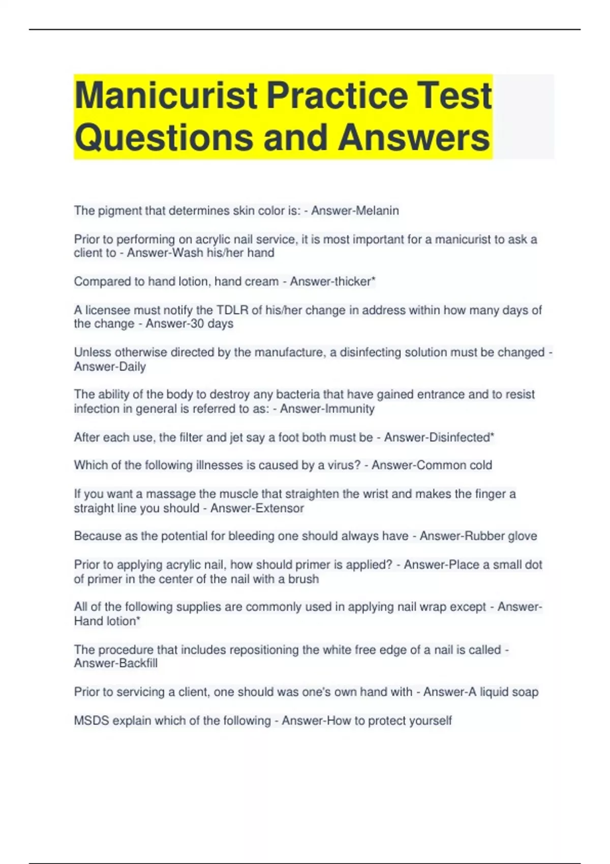 Manicurist Practice Test Questions and Answers (2) The pigment that determines skin color is: - Answer-Melanin Prior to performing on acrylic nail service, it is most important for a manicurist to ask a client to - Answer-Wash his/her hand Compared to hand lotion, hand cream - Answer-thicker* A licensee must notify the TDLR of his/her change in address within how many days of the change - Answer-30 days Unless otherwise directed by the manufacture, a disinfecting solution must be changed - Answer-Daily The ability of the body to destroy any bacteria that have gained entrance and to resist infection in general is referred to as: - Answer-Immunity After each use, the filter and jet say a foot both must be - Answer-Disinfected* Which of the following illnesses is caused by a virus? - Answer-Common cold If you want a massage the muscle that straighten the wrist and makes the finger a straight line you should - Answer-Extensor Because as the potential for bleeding one should always have - Answer-Rubber glove Prior to applying acrylic nail, how should primer is applied? - Answer-Place a small dot of primer in the center of the nail with a brush All of the following supplies are commonly used in applying nail wrap except - Answer- Hand lotion* The procedure that includes repositioning the white free edge of a nail is called - Answer-Backfill