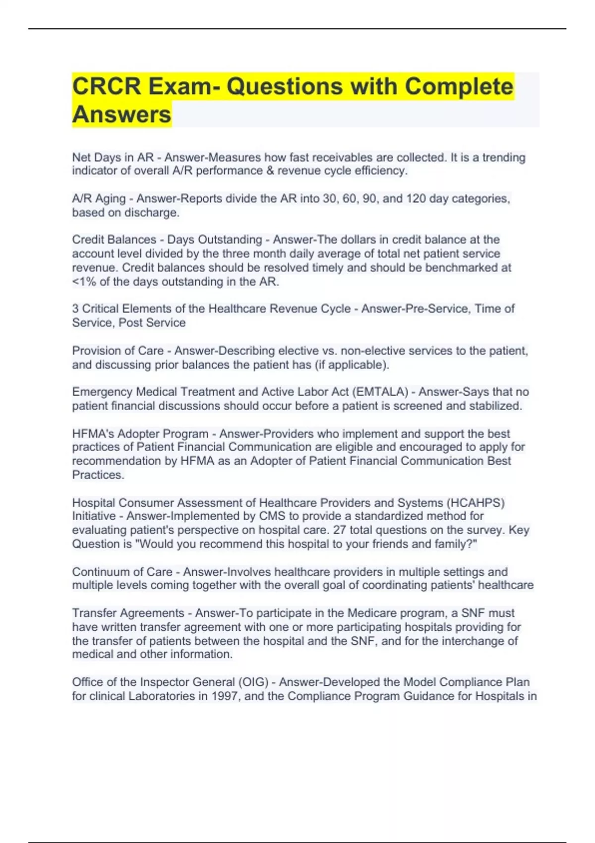 Net Days in AR - Answer-Measures how fast receivables are collected. It is a trending indicator of overall A/R performance & revenue cycle efficiency. A/R Aging - Answer-Reports divide the AR into 30, 60, 90, and 120 day categories, based on discharge. Credit Balances - Days Outstanding - Answer-The dollars in credit balance at the account level divided by the three month daily average of total net patient service revenue. Credit balances should be resolved timely and should be benchmarked at 1% of the days outstanding in the AR. 3 Critical Elements of the Healthcare Revenue Cycle - Answer-Pre-Service, Time of Service, Post Service Provision of Care - Answer-Describing elective vs. non-elective services to the patient, and discussing prior balances the patient has (if applicable). Emergency Medical Treatment and Active Labor Act (EMTALA) - Answer-Says that no patient financial discussions should occur before a patient is screened and stabilized. HFMA's Adopter Program - Answer-Providers who implement and support the best practices of Patient Financial Communication are eligible and encouraged to apply for recommendation by HFMA as an Adopter of Patient Financial Communication Best Practices. Hospital Consumer Assessment of Healthcare Providers and Systems (HCAHPS) Initiative - Answer-Implemented by CMS to provide a standardized method for evaluating patient's perspective on hospital care. 27 total questions on the survey. Key Question is "Would you recommend this hospital to your friends and family?" Continuum of Care - Answer-Involves healthcare providers in multiple settings and multiple levels coming together with the overall goal of coordinating patients' healthcare Transfer Agreements - Answer-To participate in the Medicare program, a SNF must have written transfer agreement with one or more participating hospitals providing for the transfer of patients between the hospital and the SNF, and for the interchange of medical and other information. Office of the Inspector General (OIG) - Answer-Developed the Model Compliance Plan for clinical Laboratories in 1997, and the Compliance Program Guidance for Hospitals in