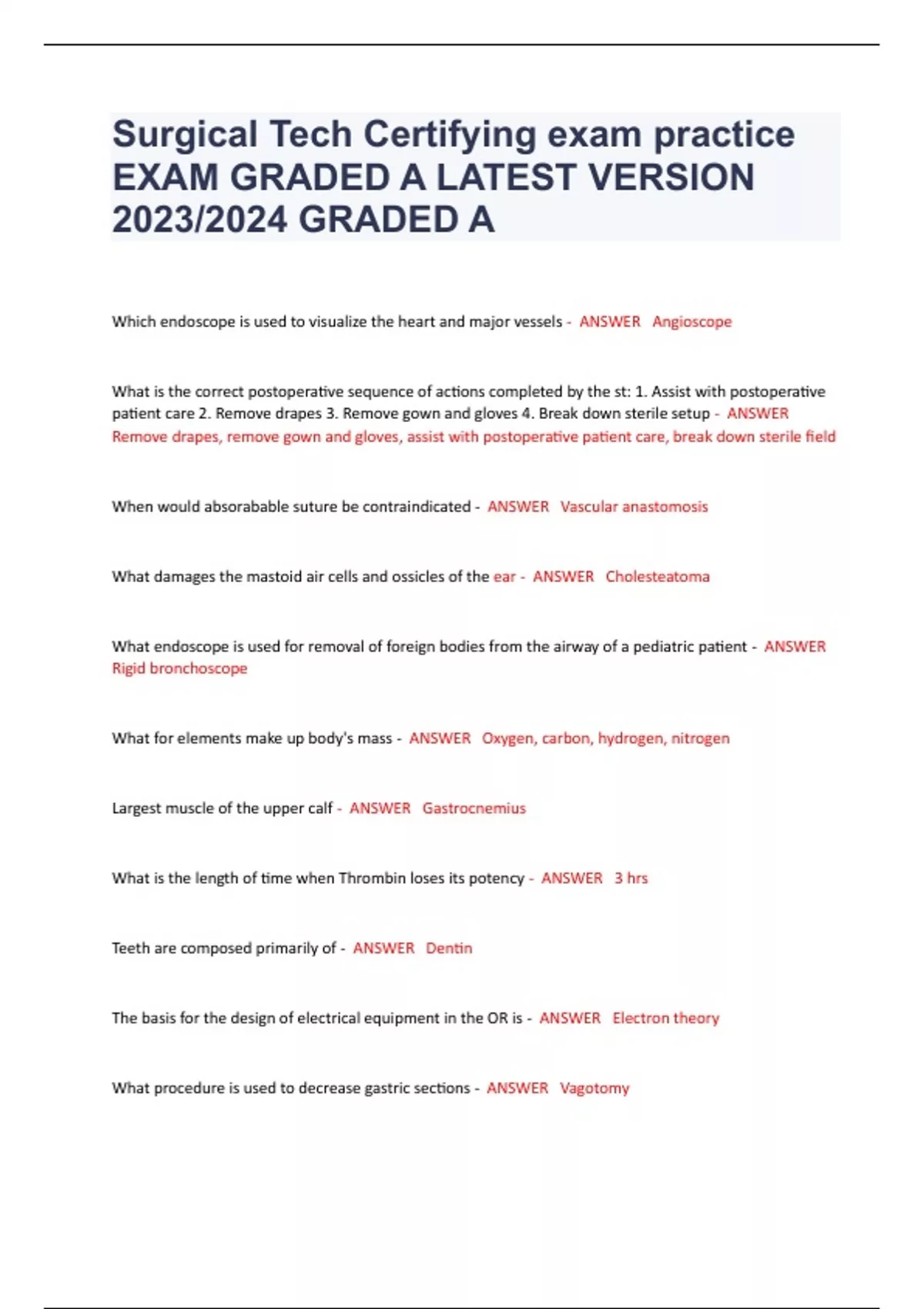 Surgical Tech Certifying exam practice EXAM GRADED A LATEST VERSION 2023/2024 GRADED A Which endoscope is used to visualize the heart and major vessels - ANSWER Angioscope What is the correct postoperative sequence of actions completed by the st: 1. Assist with postoperative patient care 2. Remove drapes 3. Remove gown and gloves 4. Break down sterile setup - ANSWER Remove drapes, remove gown and gloves, assist with postoperative patient care, break down sterile field When would absorabable suture be contraindicated - ANSWER Vascular anastomosis What damages the mastoid air cells and ossicles of the ear - ANSWER Cholesteatoma What endoscope is used for removal of foreign bodies from the airway of a pediatric patient - ANSWER Rigid bronchoscope What for elements make up body's mass - ANSWER Oxygen, carbon, hydrogen, nitrogen Largest muscle of the upper calf - ANSWER Gastrocnemius What is the length of time when Thrombin loses its potency - ANSWER 3 hrs Teeth are composed primarily of - ANSWER Dentin The basis for the design of electrical equipment in the OR is - ANSWER Electron theory What procedure is used to decrease gastric sections - ANSWER Vagotomy