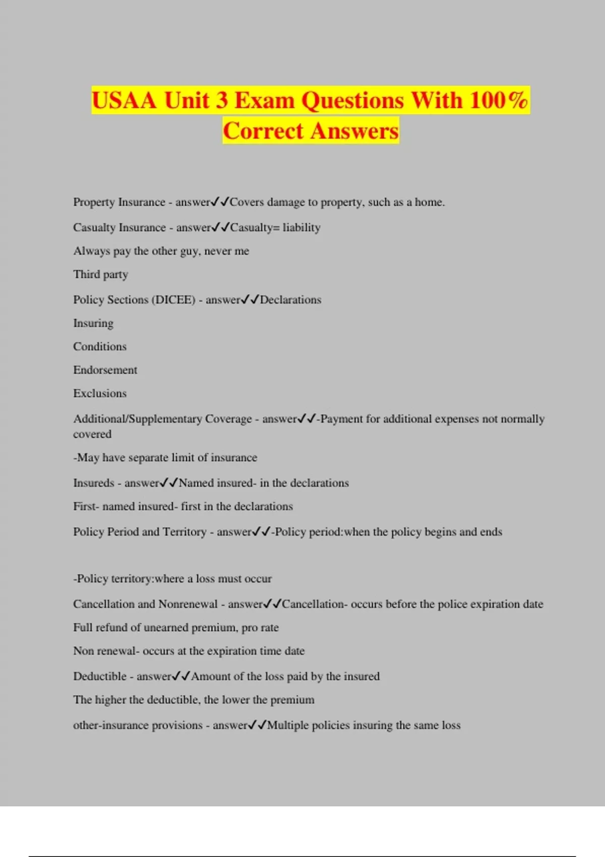 USAA Unit 3 Exam Questions With 100% Correct Answers Property Insurance - answerCovers damage to property, such as a home. Casualty Insurance - answerCasualty= liability Always pay the other guy, never me Third party Policy Sections (DICEE) - answerDeclarations Insuring Conditions Endorsement Exclusions Additional/Supplementary Coverage - answer-Payment for additional expenses not normally covered -May have separate limit of insurance Insureds - answerNamed insured- in the declarations First- named insured- first in the declarations Policy Period and Territory - answer-Policy period:when the policy begins and ends -Policy territory:where a loss must occur Cancellation and Nonrenewal - answerCancellation- occurs before the police expiration date Full refund of unearned premium, pro rate Non renewal- occurs at the expiration time date Deductible - answerAmount of the loss paid by the insured The higher the deductible, the lower the premium other-insurance provisions - answerMultiple policies insuring the same loss Named Insured Duties after Loss (PPC-MSP) - answerProm