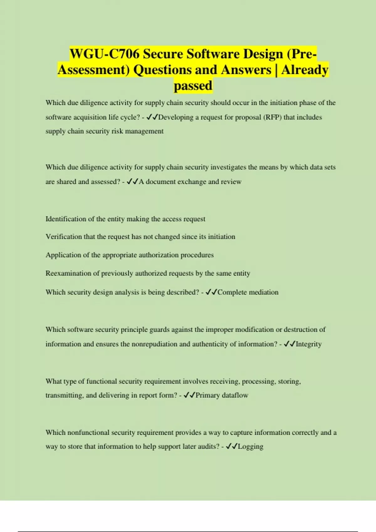 WGU-C706 Secure Software Design (PreAssessment) Questions and Answers | Already passed