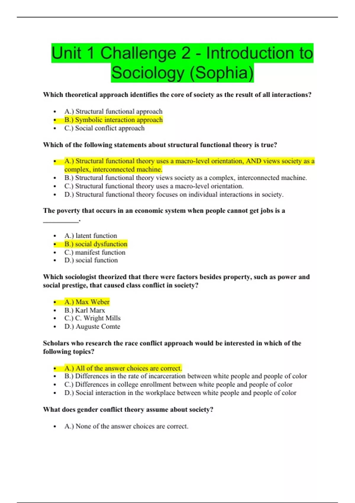Unit 1 Challenge 2 - Introduction to Sociology (Sophia) Which theoretical approach identifies the core of society as the result of all interactions? • A.) Structural functional approach • B.) Symbolic interaction approach • C.) Social conflict approach Which of the following statements about structural functional theory is true? • A.) Structural functional theory uses a macro-level orientation, AND views society as a complex, interconnected machine. • B.) Structural functional theory views society as a complex, interconnected machine. • C.) Structural functional theory uses a macro-level orientation. • D.) Structural functional theory focuses on individual interactions in society. The poverty that occurs in an economic system when people cannot get jobs is a __________. • A.) latent function • B.) social dysfunction • C.) manifest function • D.) social function Which sociologist theorized that there were factors besides property, such as power and social prestige, that caused class conflict in society? • A.) Max Weber • B.) Karl Marx • C.) C. Wright Mills • D.) Auguste Comte Scholars who research the race conflict approach would be interested in which of the following topics? • A.) All of the answer choices are correct. • B.) Differences in the rate of incarceration between white people and people of color • C.) Differences in college enrollment between white people and people of color • D.) Social interaction in the workplace between white people and people of color What does gender conflict theory assume about society? • A.) None of the answer choices are correct.