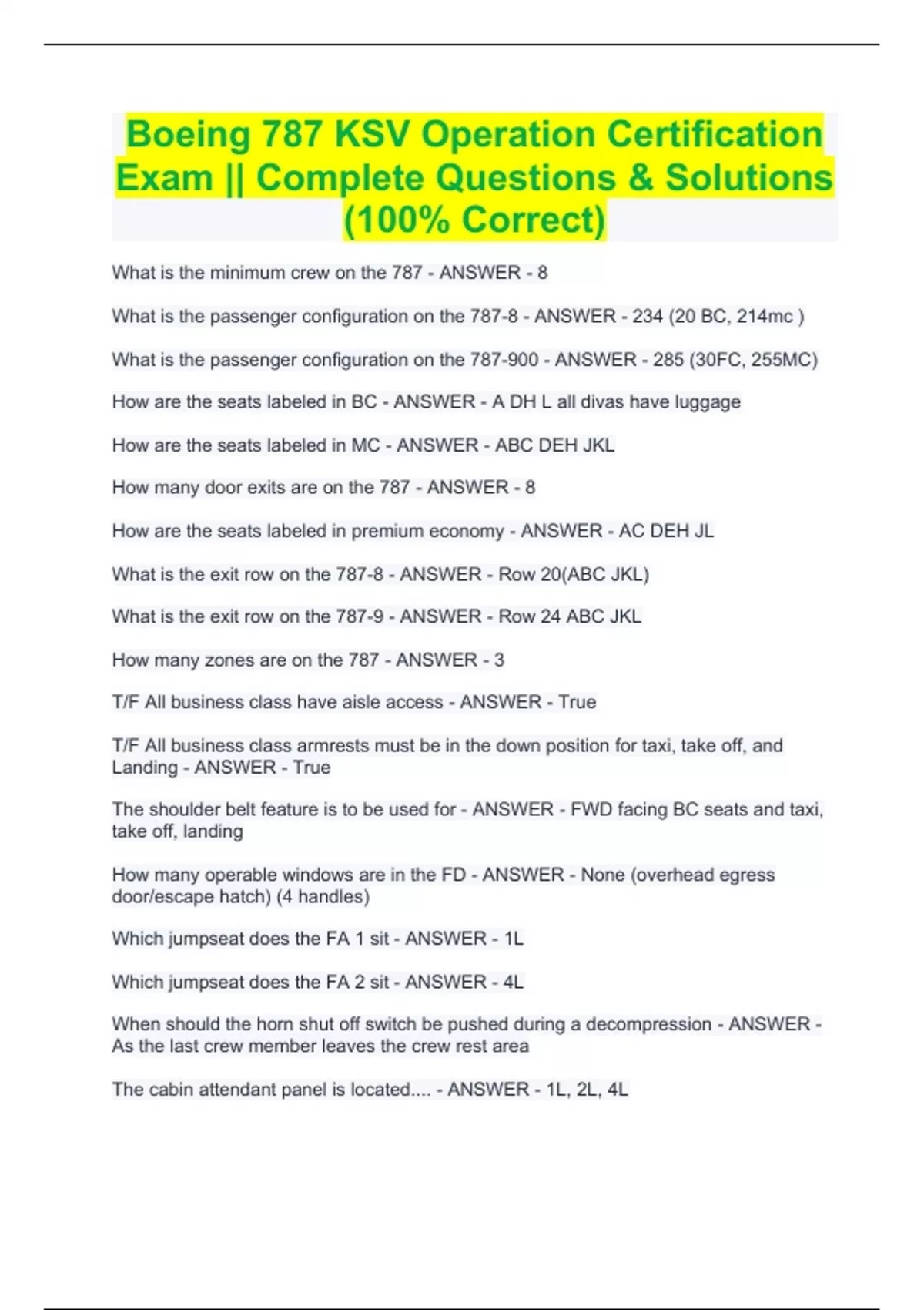 Boeing 787 KSV Operation Certification Exam || Complete Questions & Solutions (100% Correct) Boeing 787 KSV Operation Certification Exam || Complete Questions & Solutions (100% Correct) What is the minimum crew on the 787 - ANSWER - 8 What is the passenger configuration on the 787-8 - ANSWER - 234 (20 BC, 214mc ) What is the passenger configuration on the 787-900 - ANSWER - 285 (30FC, 255MC) How are the seats labeled in BC - ANSWER - A DH L all divas have luggage How are the seats labeled in MC - ANSWER - ABC DEH JKL How many door exits are on the 787 - ANSWER - 8 How are the seats labeled in premium economy - ANSWER - AC DEH JL What is the exit row on the 787-8 - ANSWER - Row 20(ABC JKL) What is the exit row on the 787-9 - ANSWER - Row 24 ABC JKL How many zones are on the 787 - ANSWER - 3 T/F All business class have aisle access - ANSWER - True T/F All business class armrests must be in the down position for taxi, take off, and Landing - ANSWER - True The shoulder belt feature is to be used for - ANSWER - FWD facing BC seats and taxi, take off, landing How many operable windows are in the FD - ANSWER - None (overhead egress door/escape hatch) (4 handles) Which jumpseat does the FA 1 sit - ANSWER - 1L Which jumpseat does the FA 2 sit - ANSWER - 4L When should the horn shut off switch be pushed during a decompression - ANSWER - As the last crew member leaves the crew rest area The cabin attendant panel is located.... - ANSWER - 1L, 2L, 4L