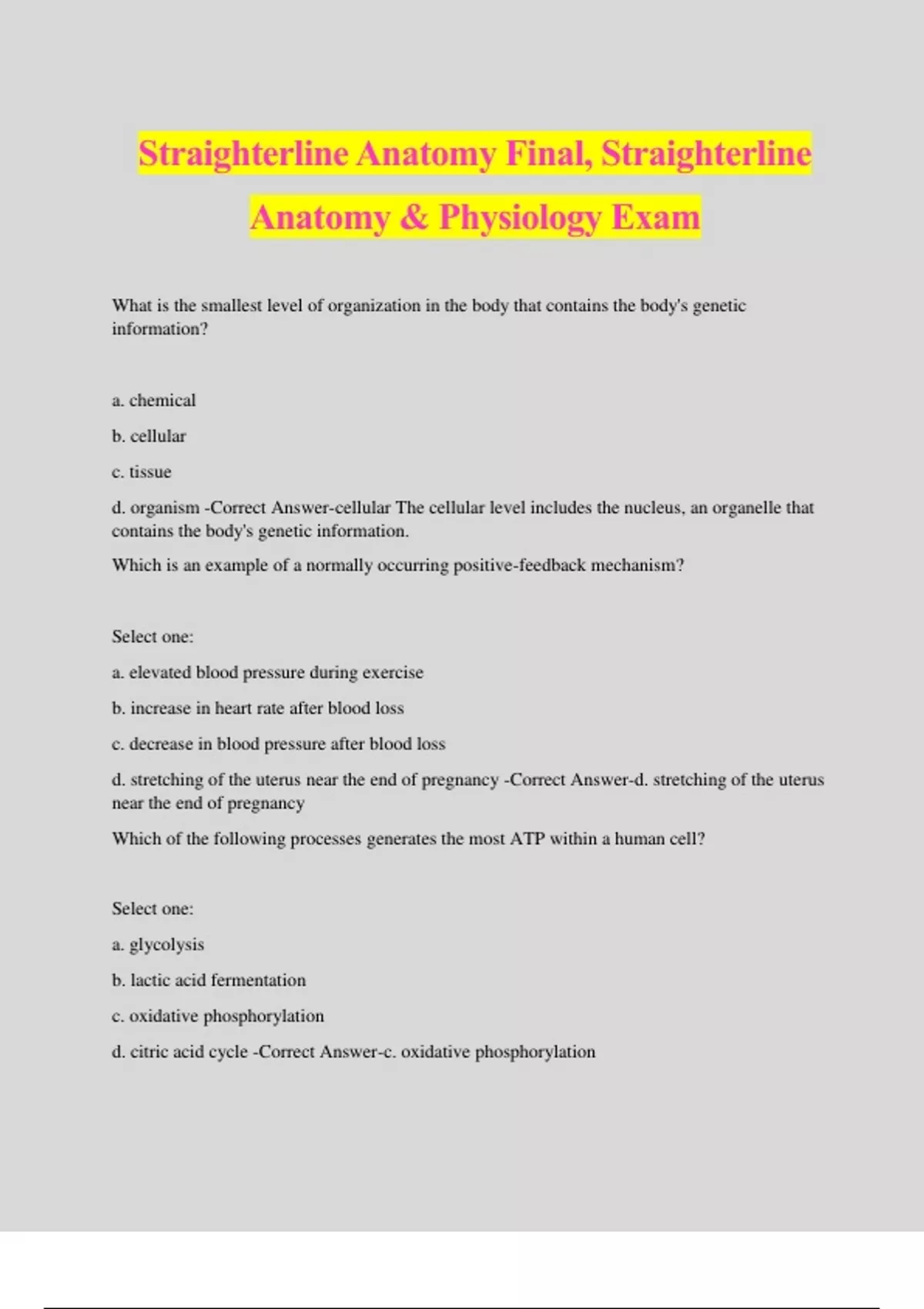 Straighterline Anatomy Final, Straighterline Anatomy & Physiology Exam What is the smallest level of organization in the body that contains the body's genetic information? a. chemical b. cellular c. tissue d. organism -Correct Answer-cellular The cellular level includes the nucleus, an organelle that contains the body's genetic information. Which is an example of a normally occurring positive-feedback mechanism? Select one: a. elevated blood pressure during exercise b. increase in heart rate after blood loss c. decrease in blood pressure after blood loss d. stretching of the uterus near the end of pregnancy -Correct Answer-d. stretching of the uterus near the end of pregnancy Which of the following processes generates the most ATP within a human cell? Select one: a. glycolysis b. lactic acid fermentation c. oxidative phosphorylation d. citric acid cycle -Correct Answer-c. oxidative phosphorylation During DNA replication, how does each template strand eventually become two identical DNA molecules? Select one: a. The two strands form continuously, catalyzed by DNA polymerase. b. The two strands form continuously, catalyzed by DNA ligase. c. One strand forms continuously, the other forms in short segments spliced by DNA polymerase. d. One strand forms continuously, the other forms in short segments spliced by DNA ligase. - Correct Answer-d. One strand forms continuously, the other forms in short segments spliced by DNA ligase. There is a leading strand and a lagging strand; they don't both form continuously. Which is the most superficial layer of skin that is composed primarily of living cells? Select one: a. stratum corneum b. stratum lucidum c. stratum basale spinosum. d. stratum spinosum -Correct Answer-. d. stratum spinosum (stratum basale layer is below the stratum spinosum) Which of the following is the definition of a third degree burn? Select one: a. a burn that covers at least 25% of the skin b. a burn that has destroyed the dermis and epidermis c. a burn that can only be caused by fire d. a burn that does not leave scars -Correct Answer-a burn that has destroyed the dermis and epidermis. How much skin the burn covers does not definite which degree of burn it is. Which of the following types of openings in