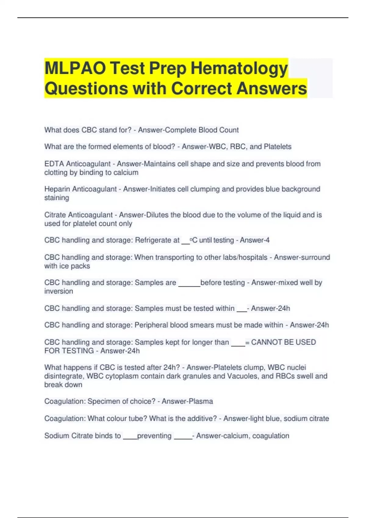MLPAO Test Prep Hematology Questions with Correct Answers (2) What does CBC stand for? - Answer-Complete Blood Count What are the formed elements of blood? - Answer-WBC, RBC, and Platelets EDTA Anticoagulant - Answer-Maintains cell shape and size and prevents blood from clotting by binding to calcium Heparin Anticoagulant - Answer-Initiates cell clumping and provides blue background staining Citrate Anticoagulant - Answer-Dilutes the blood due to the volume of the liquid and is used for platelet count only CBC handling and storage: Refrigerate at ᵒC until testing - Answer-4 CBC handling and storage: When transporting to other labs/hospitals - Answer-surround with ice packs CBC handling and storage: Samples are before testing - Answer-mixed well by inversion CBC handling and storage: Samples must be tested within - Answer-24h CBC handling and storage: Peripheral blood smears must be made within - Answer-24h CBC handling and storage: Samples kept for longer than = CANNOT BE USED FOR TESTING - Answer-24h What happens if CBC is tested after 24h? - Answer-Platelets clump, WBC nuclei disintegrate, WBC cytoplasm contain dark granules and Vacuoles, and RBCs swell and break down Coagulation: Specimen of choice? - Answer-Plasma