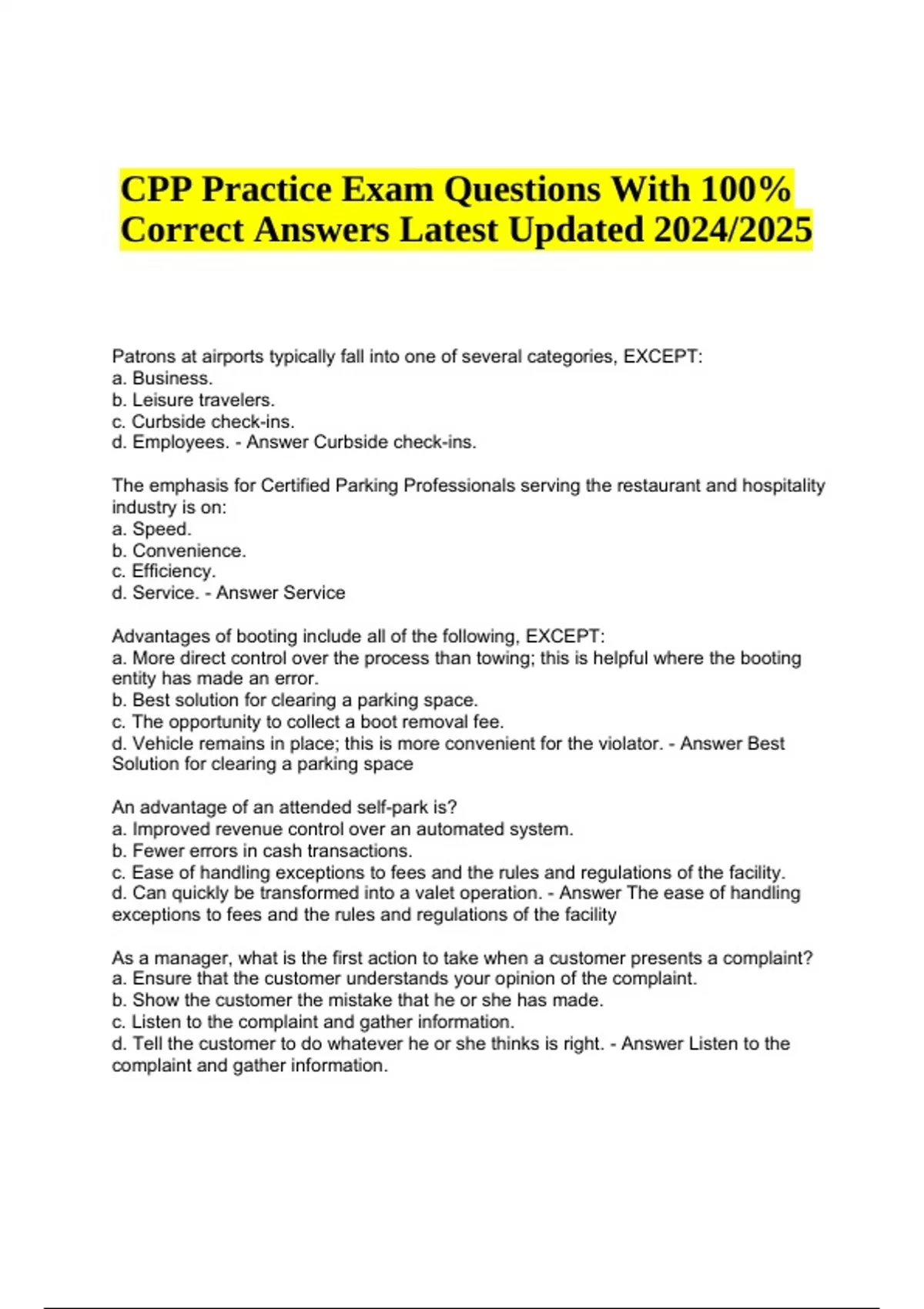 CPP Practice Exam Questions With 100% Correct Answers Latest Updated 2024/2025. Patrons at airports typically fall into one of several categories, EXCEPT: a. Business. b. Leisure travelers. c. Curbside check-ins. d. Employees. - Answer Curbside check-ins. The emphasis for Certified Parking Professionals serving the restaurant and hospitality industry is on: a. Speed. b. Convenience. c. Efficiency. d. Service. - Answer Service Advantages of booting include all of the following, EXCEPT: a. More direct control over the process than towing; this is helpful where the booting entity has made an error. b. Best solution for clearing a parking space. c. The opportunity to collect a boot removal fee. d. Vehicle remains in place; this is more convenient for the violator. - Answer Best Solution for clearing a parking space An advantage of an attended self-park is? a. Improved revenue control over an automated system. b. Fewer errors in cash transactions. c. Ease of handling exceptions to fees and the rules and regulations of the facility. d. Can quickly be transformed into a valet operation. - Answer The ease of handling exceptions to fees and the rules and regulations of the facility As a manager, what is the first action to take when a customer presents a complaint? a. Ensure that the customer understands your opinion of the complaint. b. Show the customer the mistake that he or she has made. c. Listen to the complaint and gather information. d. Tell the customer to do whatever he or she thinks is right. - Answer Listen to the complaint and gather information. CPP Practice Exam Questions With 100% Correct Answers Latest Updated 2024/2025 A facility manager will best help employees to deal with customer complaints if the manager does what? a. Handles every complaint personally. b. Requires employees to take the complaints in writing. c. Trains employees to deal with complaints. d. Insists that employees resolve customer complaints without bothering the manager. - Answer Trains employees to deal with complaints. How should a manager deal with an unsatisfied customer whose complaint has not been handled correctly by an employee? a. Promise to take care of the problem. b. Tell the customer that there is nothing else that can be done. c. Listen to the customer and try to understand the complaint. d. Refer the customer to the main office. - Answer Listen to the customer and try to understand the complaint Upon a customer's return, a valet should not do what? a. Pick up all loose trash inside the vehicle. b. Help the customer store items in vehicle if necessary. c. Wait for the customer to enter the vehicle. d. Close the vehicle door once the customer is inside. - Answer Pick up all loose trash inside the vehicle. A Certified Parking Professional has interviewed two candidates for a cashier's position. Both are excellent potential employees. One candidate has a disability and the other does not. According to the ADA, which candidate should get the job? a. The candidate with no disability. b. The disabled candidate. c. The one most qualified. d. The candidate needing the least accommodation. - Answer The one who is most qualified What is an example of a discriminatory description of a job function? a. Maintenance position, part-time, preferably college student. b. Person with 2 years' cashier experience. c. Retired military man needed for security work. d. Youthful person to hustle cars on a big lot. - Answer Maintenance position, part-time, preferably college student. What is an illegal question to ask a candidate for a valet position during an employment interview? a. Do you have a valid driver's license? b. Can I depend on you to work every weekend? c. Are you able to ride a man lift? d. Is your age going to slow you down? - Answer Is your age going to slow you down? Which of the following approaches will most effectively minimize employee relations difficulties? a. Install a suggestion box. b. Increase the amount of supervision provided to employees. c. Implement a quality control program. d. Maintain an open line of direct and factual communication with employees. - Answer Maintain an open line of direct and factual communication with employees. It is important to keep the entrance area clear in order to? a. Align cars with parking spaces. b. Provide special VIP parking. c. Keep traffic flowing into the facility. d. Avoid accidents. - Answer Keep traffic flowing into the facility. The facility is a self-park, commercially operated facility with 1500 spaces. Which of the following is an important consideration for signs? a. Signs for drivers should be separate from signs for pedestrians. b. Pedestrian signs should be posted at 4 feet above the ground. c. Signs should contain very detailed information.