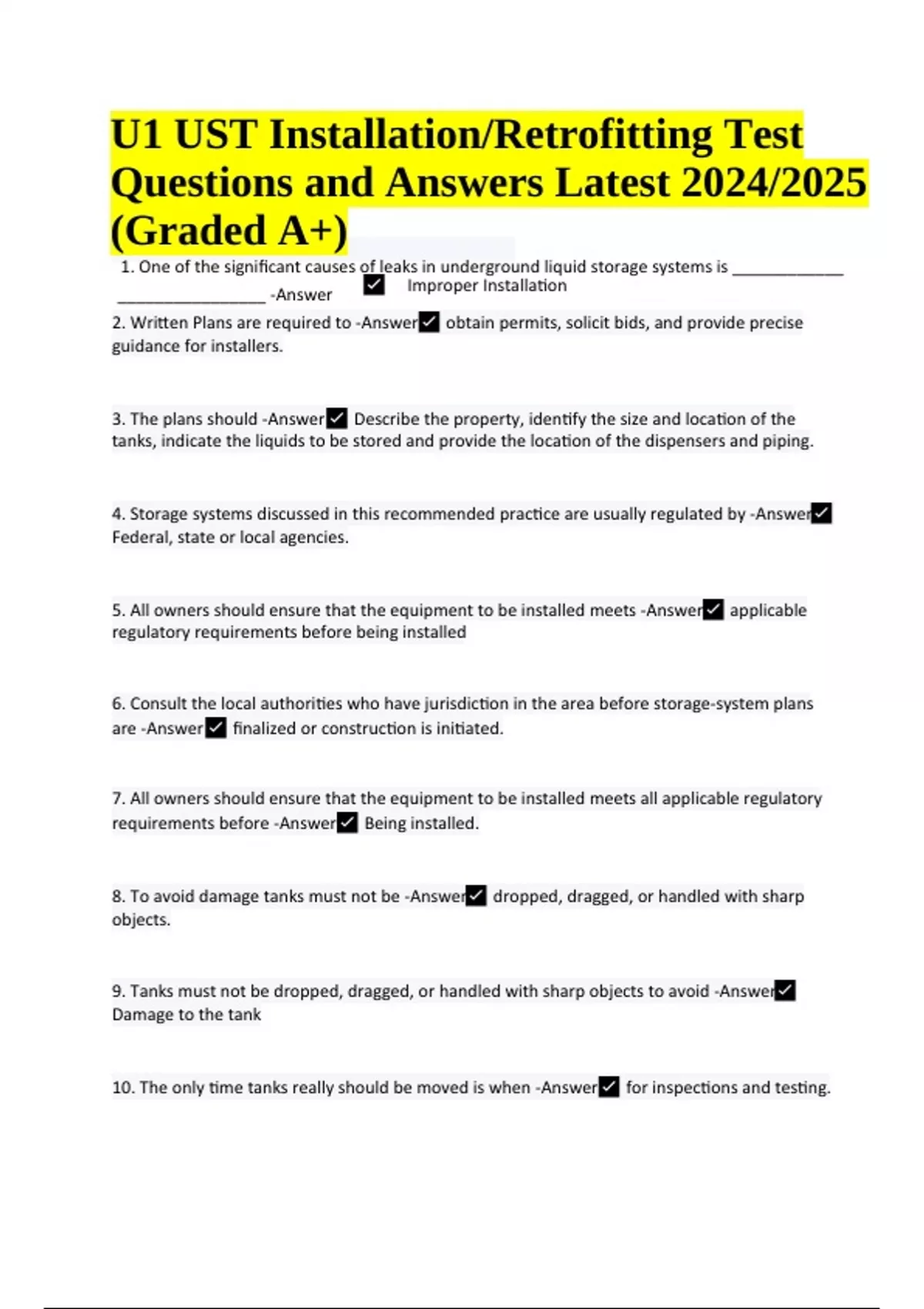 UST Installation/Retrofitting Test Questions and Answers Latest 2024/2025 (Graded A+) One of the significant causes of leaks in underground liquid storage systems is ____________ ________________ -Answer Improper Installation 2. Written Plans are required to -Answerobtain permits, solicit bids, and provide precise guidance for installers. 3. The plans should -AnswerDescribe the property, identify the size and location of the tanks, indicate the liquids to be stored and provide the location of the dispensers and piping. 4. Storage systems discussed in this recommended practice are usually regulated by -Answer Federal, state or local agencies. 5. All owners should ensure that the equipment to be installed meets -Answerapplicable regulatory requirements before being installed 6. Consult the local authorities who have jurisdiction in the area before storage-system plans are -Answer finalized or construction is initiated. 7. All owners should ensure that the equipment to be installed meets all applicable regulatory requirements before -AnswerBeing installed. 8. To avoid damage tanks must not be -Answer dropped, dragged, or handled with sharp objects. 9. Tanks must not be dropped, dragged, or handled with sharp objects to avoid -Answer Damage to the tank 10. The only time tanks really should be moved is when -Answer for inspections and testing. U1 UST Installation/Retrofitting Test Questions and Answers Latest 2024/2025 (Graded A+) 11. If a tanks is damaged at all throughout the moving process it must be -AnswerRepaired in accordance with the manufacture's instructions. 12. The proper way to move a tank is by lifting it, using the -AnswerLift lugs that are installed by the manufacturer. 13. Tanks should be carefully lifted and lowered using -AnswerCables or chains of adequate length. 14. When two lifting lugs are being used, the angle between the lifting cable and vertical should be no more than -Answer30 degrees. 15. Stockpile piping materials and equipment in a _____________ _________ on the job site - Answer Secure area 16. Confirm adherence to specifications by reporting to the owner about any -Answer detected damage that could result in leakage or premature corrosion. 17. Pressure test single-walled tanks with _____ to _______ psig air pressure, soaping all surfaces, seams and fittings while inspecting for bubbles. -Answer 3 to 5 18. Air testing with over ___ psig (3 Psig for 12-Ft. Diameter FRP tanks) is hazardous and may damage the tank -Answer5 psig 19. Do not air test a tank that has previously contained -Answer flammable or combustible liquids 20. Place ______ barricades at the ends of tanks being tested. -AnswerWarning 21. Avoid tank ends, man-ways, and fittings while the tank is under -Answer Pressure 22. Release pressure in the tank before disconnecting any -Answergauges or test fittings. 23. Be aware some manufactures do not tighten fittings to allow for _____________ _____________ during shipping and storage. -AnswerTemperature changes 24. True or False: Air tests are inconclusive without soaping and careful inspection for bubbles? - Answer True 25. Tanks gauges must have a scale that will permit detection of small changes in __________ that might go undetected on gauges with a ___________ _________. -AnswerPressure, broader range. 26. Since the best accuracy of gauges is at mid-range, and test pressures must not exeed 5 psig, use a gauge with a maximum limit of ____ or ______ -Answer 10 or 15 psig 27. Check the gauges __________ and _________ before use -Answer operation and accuracy 28. Underground storage systems may include vapor-recovery -AnswerPiping and equipment 29. What can cause premature storage-system failures _________ -AnswerDebris and other foreign materials 30. Tank installers should have gone through training programs to improve their skills and insure the install is __________ -Answer Successful 31. __________ kinds of plans are required to obtain permits, solicit bids, and provide precise guidance for installers -Answerwritten 32. ___________________ should insure that the equipment to be installed meets all applicable regulatory requirements before beginning an installation -AnswerOwners 33. Tanks should be ___________ inspected before installation -AnswerVisually 34. 2 Gauges should be used to reduce ___________ ____________ -Answer gauge failure 35. A pressure-relief device should e used to prevent _______________ ____________ - Answer Over pressurization 36. True of False: Over pressurization could be a result of temperature changes -Answer True 37. To avoid damaging the interstitial space between tank walls from over-pressurization, avoid pressurizing the inner tank to a maximum of______ psig -Answer 5 psig 38. Double wall tanks pressure should be monitored for _____ hour -Answer 1 39. If a compartment has single walled bulkheads, test the compartments on ___________ ___________ of the same bulkhead at different times. -AnswerA. Opposite sides B. Different sides C. Adjacent sides D. Congruent sides Answer B 40. If the compartmented tank has double-walled bulkheads, compartments may be tested at the _____________ __________ -AnswerA. First time B. Second time C. Same time D. Last time Answer C