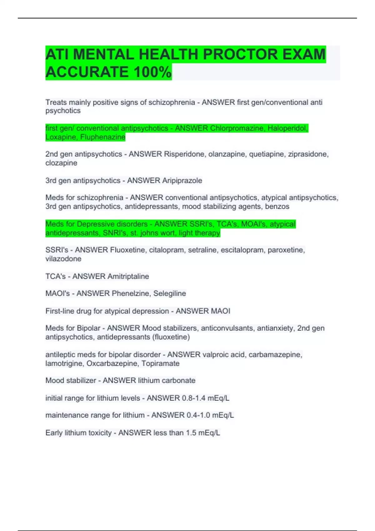 Treats mainly positive signs of schizophrenia - ANSWER first gen/conventional anti psychotics first gen/ conventional antipsychotics - ANSWER Chlorpromazine, Haloperidol, Loxapine, Fluphenazine 2nd gen antipsychotics - ANSWER Risperidone, olanzapine, quetiapine, ziprasidone, clozapine 3rd gen antipsychotics - ANSWER Aripiprazole Meds for schizophrenia - ANSWER conventional antipsychotics, atypical antipsychotics, 3rd gen antipsychotics, antidepressants, mood stabilizing agents, benzos Meds for Depressive disorders - ANSWER SSRI's, TCA's, MOAI's, atypical antidepressants, SNRI's, st. johns wort, light therapy SSRI's - ANSWER Fluoxetine, citalopram, setraline, escitalopram, paroxetine, vilazodone TCA's - ANSWER Amitriptaline MAOI's - ANSWER Phenelzine, Selegiline First-line drug for atypical depression - ANSWER MAOI Meds for Bipolar - ANSWER Mood stabilizers, anticonvulsants, antianxiety, 2nd gen antipsychotics, antidepressants (fluoxetine)