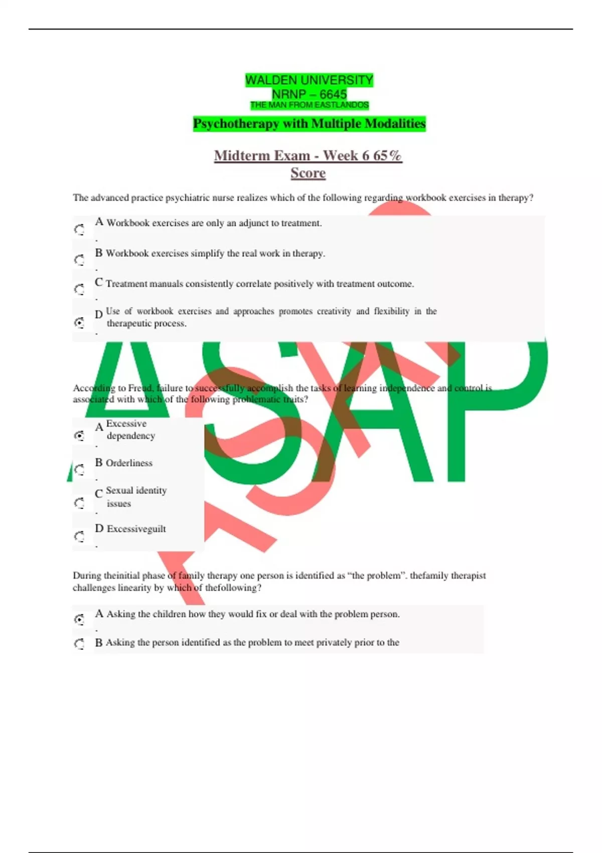 NRNP – 6645 THE MAN FROM EASTLANDOS Psychotherapy with Multiple Modalities latest update A+score 2. Schizoid personality is a pathological outcome associated with which of Erickson's psychosocial stages? A.Autonomy vs. self-doubt B.Industry vs. inferiority C.Identity vs. role confusion D.Intimacy vs. isolation 3. What distinguishes psychoanalytic therapy from other types of therapies? A.The focus on problem-solving B.The focus on irrational thoughts C.The focus on dreams and wishes D.The deep analysis of thepatient relationship with thetherapist. 4. Strategies for working with anxiety are central to all therapy approaches. Which strategy would be consistent with a behavioral therapy approach? A.Restructuring B.Interpretations C.Desensitization D.Exploring wishes 5. Good practice habits that are relevant for legal and ethical professional responsibility include which of thefollowing? Check all that apply. A.It is essential that emergency coverage is in place. B. How thepatient contacts you between sessions and in emergencies should be included in thecontract given to thepatient during theinitial session. C.Explicitly state whether you will be available for phone calls between sessions and adhere to clear limits. D.Check messages at least once per day and call back within 24 hours. Step-by-step explanation