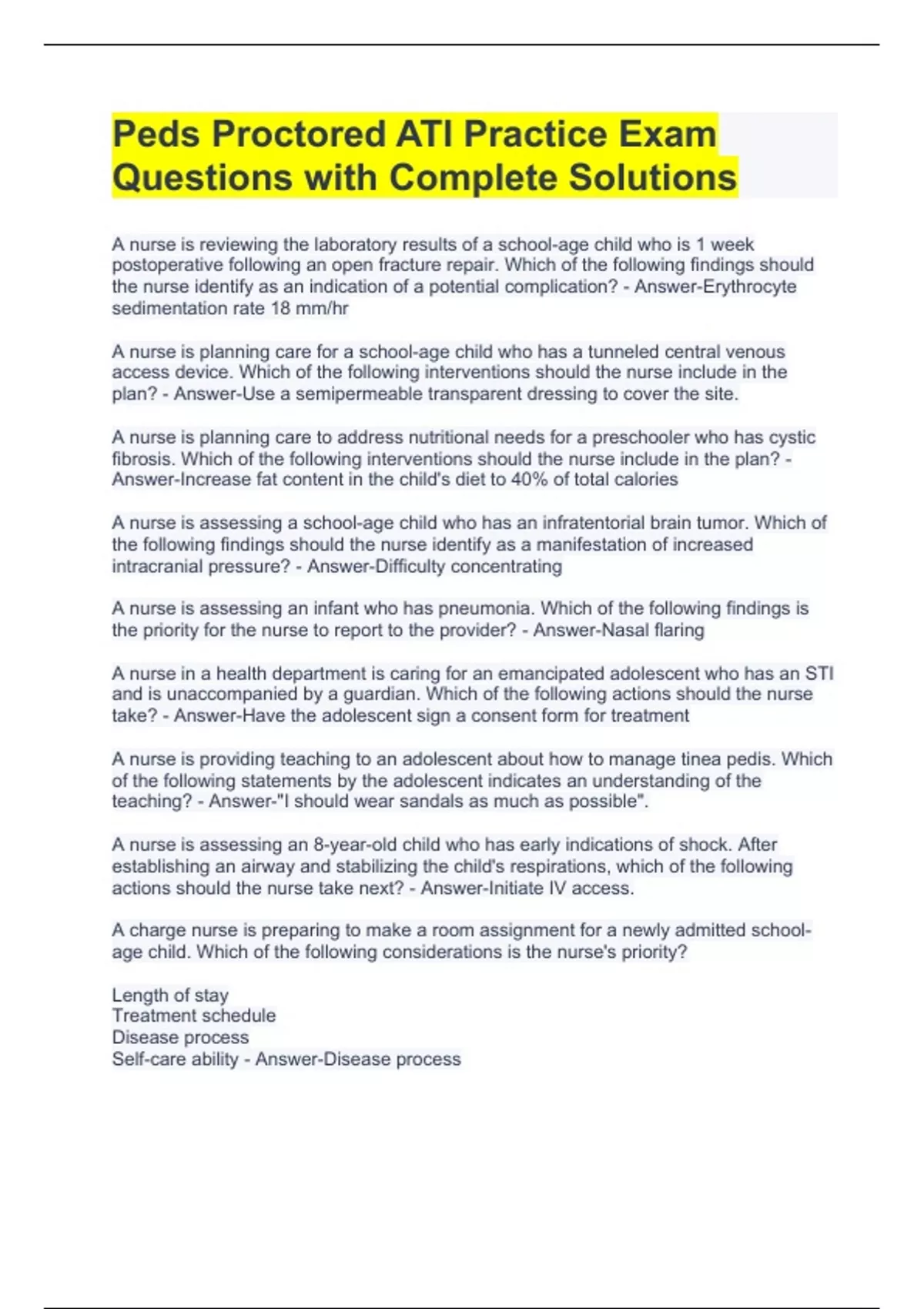 A nurse is reviewing the laboratory results of a school-age child who is 1 week postoperative following an open fracture repair. Which of the following findings should the nurse identify as an indication of a potential complication? - Answer-Erythrocyte sedimentation rate 18 mm/hr A nurse is planning care for a school-age child who has a tunneled central venous access device. Which of the following interventions should the nurse include in the plan? - Answer-Use a semipermeable transparent dressing to cover the site. A nurse is planning care to address nutritional needs for a preschooler who has cystic fibrosis. Which of the following interventions should the nurse include in the plan? - Answer-Increase fat content in the child's diet to 40% of total calories A nurse is assessing a school-age child who has an infratentorial brain tumor. Which of the following findings should the nurse identify as a manifestation of increased intracranial pressure? - Answer-Difficulty concentrating A nurse is assessing an infant who has pneumonia. Which of the following findings is the priority for the nurse to report to the provider? - Answer-Nasal flaring A nurse in a health department is caring for an emancipated adolescent who has an STI and is unaccompanied by a guardian. Which of the following actions should the nurse take? - Answer-Have the adolescent sign a consent form for treatment A nurse is providing teaching to an adolescent about how to manage tinea pedis. Which of the following statements by the adolescent indicates an understanding of the teaching? - Answer-"I should wear sandals as much as possible". A nurse is assessing an 8-year-old child who has early indications of shock. After establishing an airway and stabilizing the child's respirations, which of the following actions should the nurse take next? - Answer-Initiate IV access. A charge nurse is preparing to make a room assignment for a newly admitted school-age child. Which of the following considerations is the nurse's priority? Length of stay Treatment schedule Disease process Self-care ability - Answer-Disease process