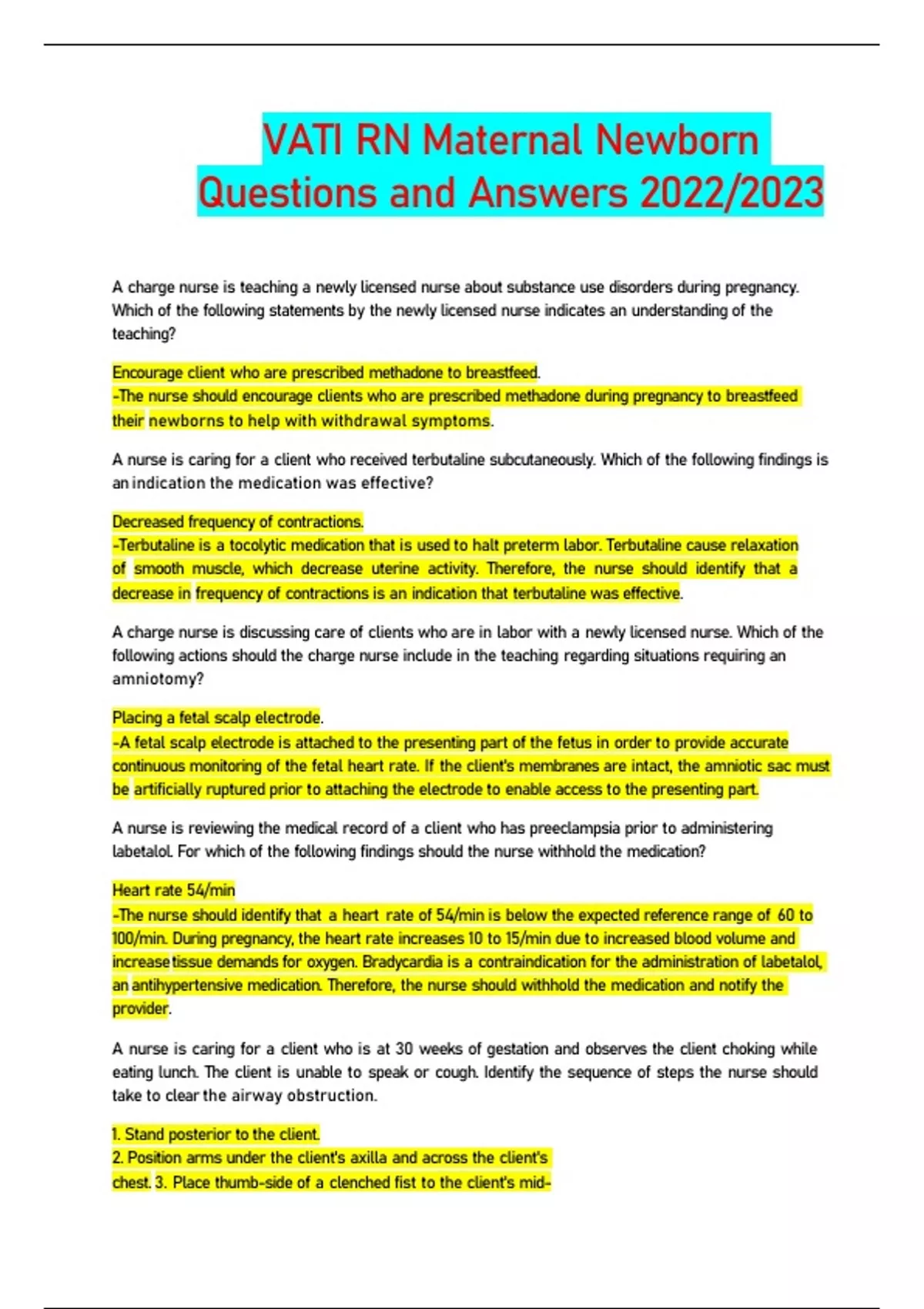 VATI RN Maternal Newborn Questions and rational Answers 2023/2024 latest update A+ pass