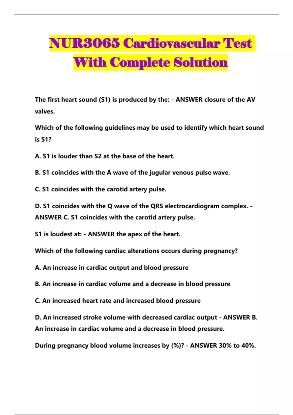 NUR3065 Cardiovascular Test With Complete Solution...