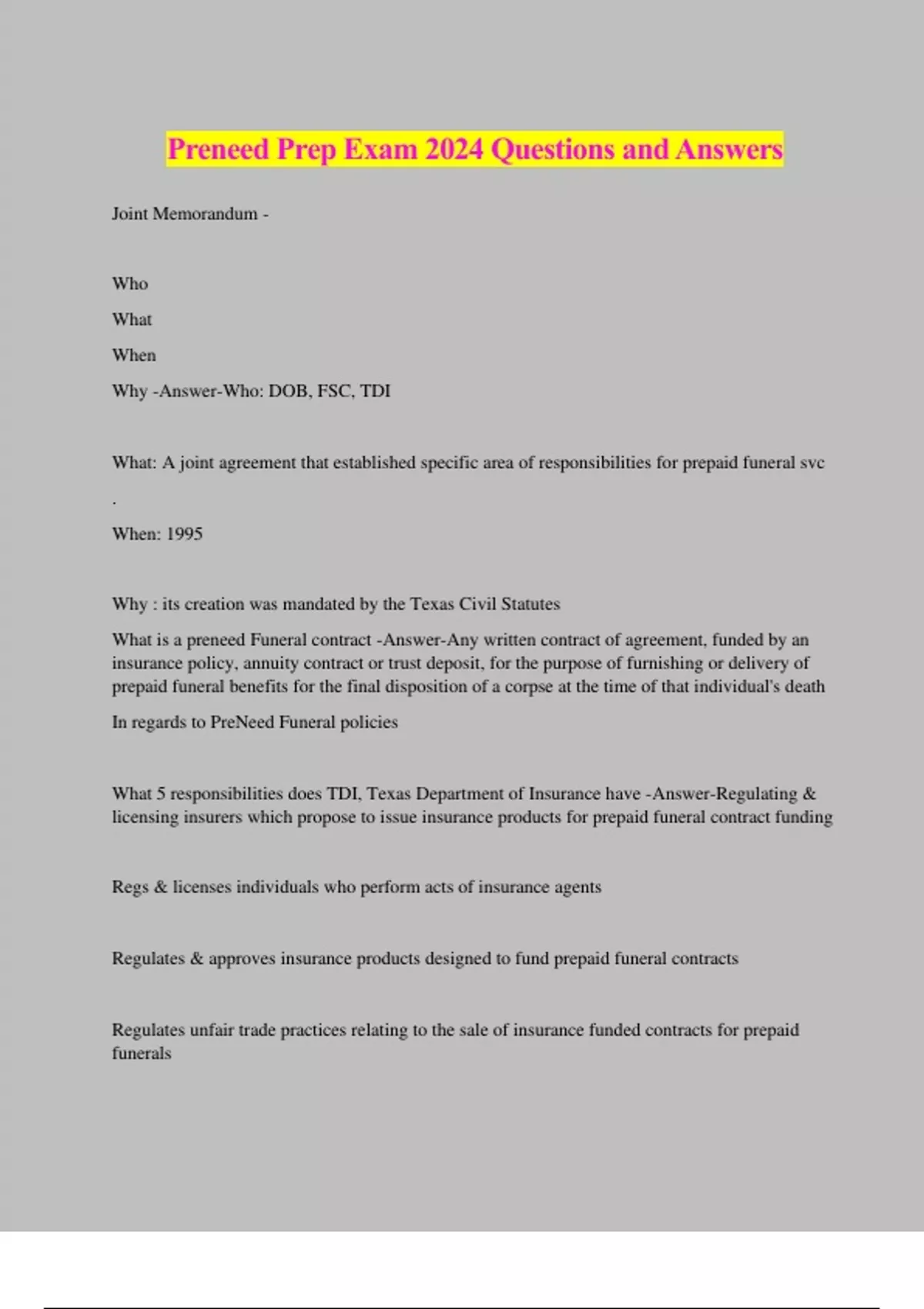 Preneed Prep Exam 2024 Questions and Answers Joint Memorandum - Who What When Why -Answer-Who: DOB, FSC, TDI What: A joint agreement that established specific area of responsibilities for prepaid funeral svc . When: 1995 Why : its creation was mandated by the Texas Civil Statutes What is a preneed Funeral contract -Answer-Any written contract of agreement, funded by an insurance policy, annuity contract or trust deposit, for the purpose of furnishing or delivery of prepaid funeral benefits for the final disposition of a corpse at the time of that individual's death In regards to PreNeed Funeral policies What 5 responsibilities does TDI, Texas Department of Insurance have -Answer-Regulating & licensing insurers which propose to issue insurance products for prepaid funeral contract funding Regs & licenses individuals who perform acts of insurance agents Regulates & approves insurance products designed to fund prepaid funeral contracts Regulates unfair trade practices relating to the sale of insurance funded contracts for prepaid funerals Regulates unfair claims practices of insurance companies Agent -Answer-An authorized representative of the parties to a contract Define Agency -Answer-A group of insurance agents, most often managed by a "general agent" who work together representing one or more insurance companies. Difference between prepaid prearrangement and preneed funeral -Answer-DOB uses Prepaid TDI uses Prepaid interchangeably with Prearrangement FTC Preneed encompasses both pre - paid and arrangement In regards to PreNeed Funeral policies What 5 responsibilities does DOB, Texas Department of Banking have -Answer-• Issuing renewal & cancellation of permits to sell PFS merchandise • Approve funeral benefit contracts & contract forms • Approve release & withdrawal of funds under certain circumstances • Est. reporting requirements & conducting audits/examinations of records • Maintaining guaranty funds for PF benefits m