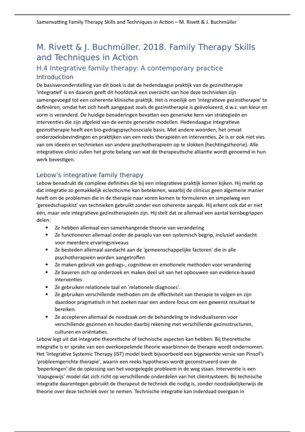Dit document bevat een samenvatting van de artikelen die gelezen moeten worden, met uitzondering van het boek van Reflecteren: de basis, van Groen. Dit is onderdeel van het vak Clinical Professional in Different Contexts aan de Universiteit Utrecht, wat een vak is in de master Clinical Child, Family, and Education Studies. Dit document wordt aangevuld wanneer er meer gelezen moet worden gedurende dit vak. Het bevat de volgende artikelen: - H.4 uit het boek Family Therapy Skills and Techniques in Action, van M. Rivett en J. Buchmüller. - Belbin, R. M. (2012). Team roles at work. London/New York: Routledge, Taylor & Francis Group. - Nooteboom, L. A., Mulder, E. A., Kuiper, C. H., Colins, O. F., & Vermeiren, R. R. (2021). Towards Integrated Youth Care: a systematic review of facilitators and barriers for professionals. Administration and policy in mental health and mental health services research, 48, 88-105. - Budd, K.S. (2005). Assessing parenting capacity in a child welfare context. Children and Youth Services Review, 27, 429-444. doi: 10.1016/youth.2004.11.008 - Bannink, F. (2012b). Positive CBT in the workplace. In F. Bannink, Practicing positive CBT. From reducing distress to building success (pp. 237-249). Wiley-Blackwell. - Kerr, D. C. R., & Capaldi, D. M. (2019). Intergenerational transmission of parenting. In M. H. Bornstein (Ed.), Handbook of parenting: Being and becoming a parent (pp. 443-481). Routledge/Taylor & Francis Group. - Melchior, M. (2021). Social inequalities in children’s mental health: Isn’t it time for action? European Child & Adolescent Psychiatry, 30,. - Russell, S. T., & Fish, J. N. (2016). Mental health in lesbian, gay, bisexual, and transgender (LGBT) youth. Annual review of clinical psychology, 12, 465-487. doi:10.1146/annurev-clinpsy- - Krebs, P. Norcross, J. C., Nicholson, J. M., & Prochaska, J. O. (2018). Stages of change and Psychotherapy outcomes: A review and meta-analysis. Journal of Clinical Psychology, 74, . doi:10.1002/jclp.22683 - Nocentini, A., Fiorentini, G., Di Paola, L., & Menesini, E. (2019). Parents, family characteristics and bullying behavior: A systemic review. Aggressive and violent behavior, 45, 4-50. - Stormshak, E. A., Kennedy, A. L., Metcalfe, R. E., & Matulis, J. M. (2022). Research on the Family Check-Up to Support Social and Behavioral Adjustment in Early Elementary School. In Family-School Partnerships During the Early School Years (pp. 73-90). Springer.