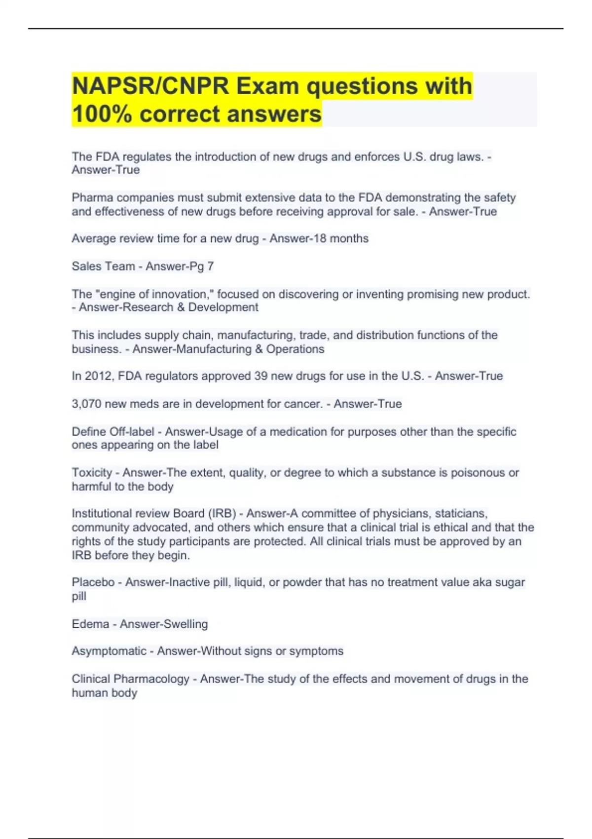The FDA regulates the introduction of new drugs and enforces U.S. drug laws. - Answer-True Pharma companies must submit extensive data to the FDA demonstrating the safety and effectiveness of new drugs before receiving approval for sale. - Answer-True Average review time for a new drug - Answer-18 months Sales Team - Answer-Pg 7 The "engine of innovation," focused on discovering or inventing promising new product. - Answer-Research & Development This includes supply chain, manufacturing, trade, and distribution functions of the business. - Answer-Manufacturing & Operations In 2012, FDA regulators approved 39 new drugs for use in the U.S. - Answer-True 3,070 new meds are in development for cancer. - Answer-True Define Off-label - Answer-Usage of a medication for purposes other than the specific ones appearing on the label Toxicity - Answer-The extent, quality, or degree to which a substance is poisonous or harmful to the body Institutional review Board (IRB) - Answer-A committee of physicians, staticians, community advocated, and others which ensure that a clinical trial is ethical and that the rights of the study participants are protected. All clinical trials must be approved by an IRB before they begin. Placebo - Answer-Inactive pill, liquid, or powder that has no treatment value aka sugar pill Edema - Answer-Swelling Asymptomatic - Answer-Without signs or symptoms Clinical Pharmacology - Answer-The study of the effects and movement of drugs in the human body