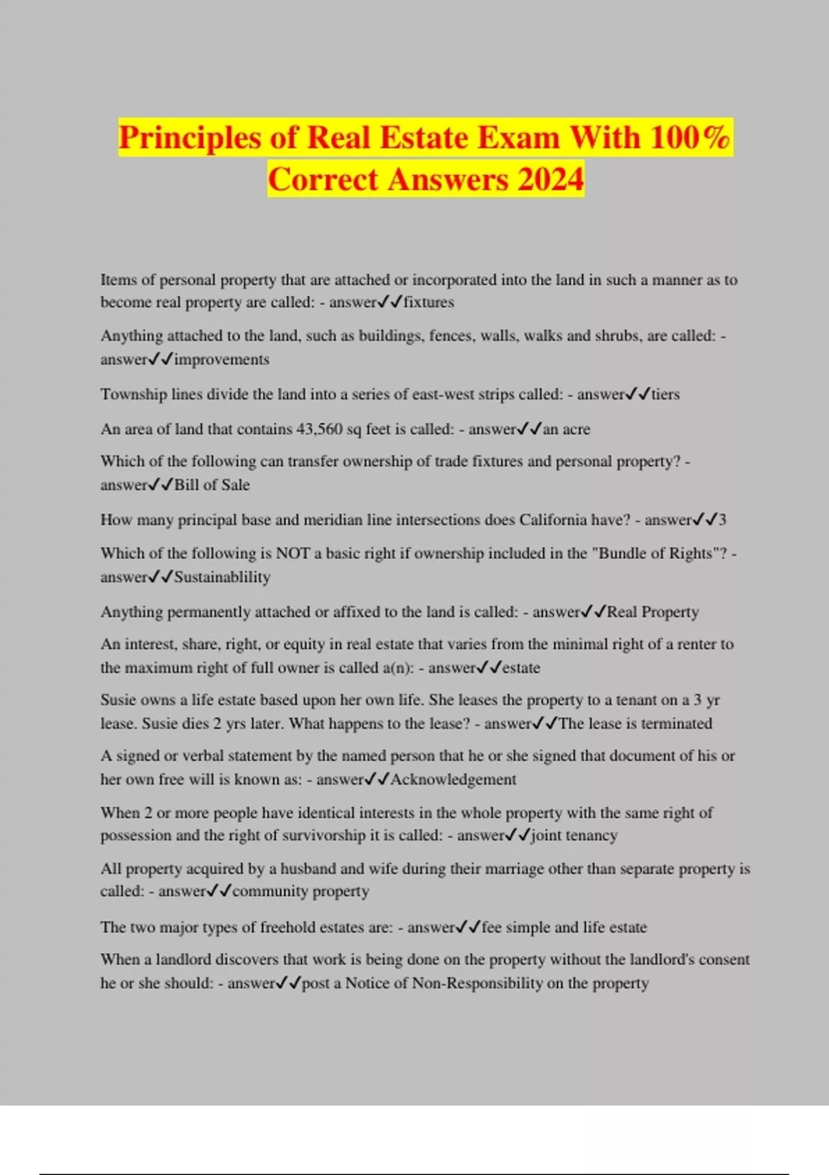 Principles of Real Estate Exam With 100% Correct Answers 2024 Items of personal property that are attached or incorporated into the land in such a manner as to become real property are called: - answerfixtures Anything attached to the land, such as buildings, fences, walls, walks and shrubs, are called: - answerimprovements Township lines divide the land into a series of east-west strips called: - answertiers An area of land that contains 43,560 sq feet is called: - answeran acre Which of the following can transfer ownership of trade fixtures and personal property? - answerBill of Sale How many principal base and meridian line intersections does California have? - answer3 Which of the following is NOT a basic right if ownership included in the "Bundle of Rights"? - answerSustainablility Anything permanently attached or affixed to the land is called: - answerReal Property An interest, share, right, or equity in real estate that varies from the minimal right of a renter to the maximum right of full owner is called a(n): - answerestate Susie owns a life estate based upon her own life. She leases the property to a tenant on a 3 yr lease. Susie dies 2 yrs later. What happens to the lease? - answerThe lease is terminated A signed or verbal statement by the named person that he or she signed that document of his or her own free will is known as: - answerAcknowledgement When 2 or more people have identical interests in the whole property with the same right of possession and the right of survivorship it is called: - answerjoint tenancy All property acquired by a husband and wife during their marriage other than separate property is called: - answercommunity property The two major types of freehold estates are: - answerfee simple and life estate When a landlord discovers that work is being done on the property without the landlord's consent he or she should: - answerpost a Notice of Non-Responsibility on the property A document that uses a property to secure the payment of a debt or the discharge of an obligation is called a(n) : - answerlien An easement that is "created for and beneficial to" the owner of adjoining or attached lands is which type of easement? - answerEasement appurtenant An Easement by Prescription requires which of the following to be valid? - answer5 yrs continuous use Open and notorious use Hostile use Property is defined as: - answerThe rights or interests that a person has in the thing owned The initials RSS refer to: - answerReally Simple Syndication "Potable Water" refers to: - answerwater suitable for drinking Which is considered real property? - answerVegetation The ownership of personal property is transferred by using a - answerBill of Sale A loan secured by personal property usually consists of - answera security agreement Which of the following is not a test for a fixture? - answerCost and size of the item Which method of land description is the oldest and least reliable? - answerMetes and Bounds A township consists: - answera 6-mile by 6- mile square of land & 36 square miles A commercial acre is: - answeran acre less the amount of land dedicated for public improvements Which of the following is a type of freehold estate? - answerEstate in fee Which of the following is an example of a freehold estate? - answera life estate A seven year lease would be considered: - answeran estate for years, personal property and chattel real. A tenancy at sufferance would occur when: - answera tenant remains in the property after expiration of a lease without the owners consent. The owner of property adjacent to the water flow can acquire title to additional land by: - answeraccession Dick and Jane, brother and sister, own an apartment building in joint tenancy. Dick needs $10,000 to cover unexpected medical expenses, so he borrows the money from a lender and signs a trust deed on the property that was soon recorded in the public records. Forty-five days later. Dick dies. Which of the following is most correct? - answerJane now owns the apartment building free and clear of her brother's $10,000 debt. Which of the following is needed to transfer property deeded "Mary Smith, a married woman"? - answerBoth husband and wife's signature If a real estate agent advises a buyer how to take title to real property, he/she may be liable for: - answerpracticing law, giving tax advise, discrimination When selling his home to John, Bert negotiated a leaseback arrangement in order to continue renting and occupying the property for the next two years. John immediately placed the unrecorded grant deed into a safe deposit box for ultimate security. Two days later, Bert "sold" the home a second time to Julie who promptly recorded her deed. Which of the following is most correct? - answerJulie is the likely owner of the property because she recorded her deed first. When a project of improvement on real property has been completed and the owner has not filed a "notice of completion," how many days do claimants have to file mechanics liens? - answer90 days The difference between property tax and special assessments is that: - answerspecial assessments are levied for the cost of specific local improvements, while property tax revenue goes into the general fund A lis pendens: - answermay affect title to the property, based upon the results of the lawsuit. Which of the following is a court order restricting a party from doing an act such as violating private deed restrictions? - answerInjunction. Which of the following will terminate an easement? - answerThe owner of the dominant tenement records a quitclaim deed. Land owner Jacobs granted the telephone company the right to erect telephone poles on his land. Which of the following best describes this situation? - answerAn encumbrance Daniel, who owned two pieces of adjacent land, sold one of them to Charles reserving an easement for himself at the time. Daniel soon left the state for 21 yrs during which time he did not use the easement. When Daniel finally