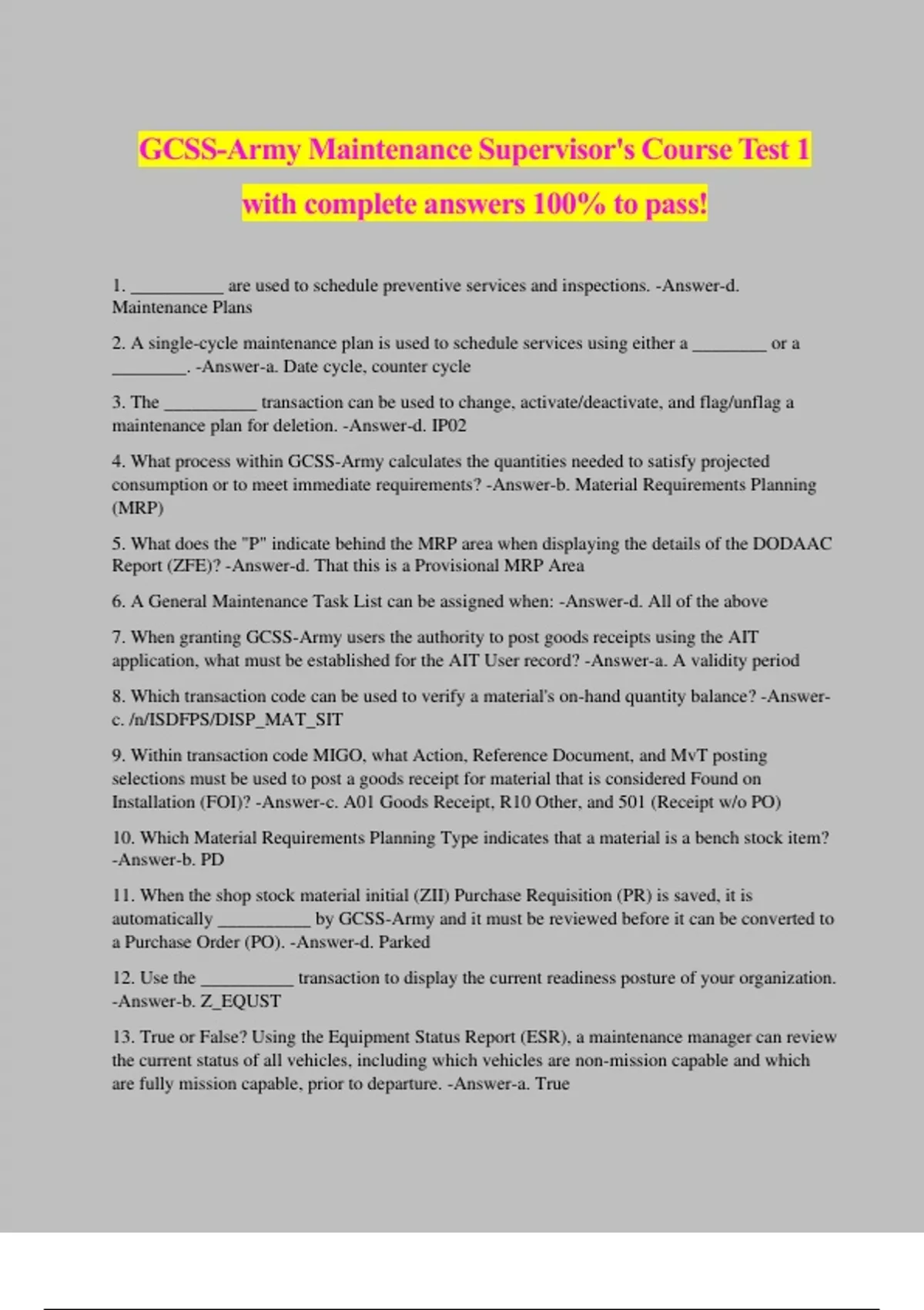 GCSS-Army Maintenance Supervisor's Course Test 1 with complete answers 100% to pass! 1. __________ are used to schedule preventive services and inspections. -Answer-d. Maintenance Plans 2. A single-cycle maintenance plan is used to schedule services using either a ________ or a ________. -Answer-a. Date cycle, counter cycle 3. The __________ transaction can be used to change, activate/deactivate, and flag/unflag a maintenance plan for deletion. -Answer-d. IP02 4. What process within GCSS-Army calculates the quantities needed to satisfy projected consumption or to meet immediate requirements? -Answer-b. Material Requirements Planning (MRP) 5. What does the "P" indicate behind the MRP area when displaying the details of the DODAAC Report (ZFE)? -Answer-d. That this is a Provisional MRP Area 6. A General Maintenance Task List can be assigned when: -Answer-d. All of the above 7. When granting GCSS-Army users the authority to post goods receipts using the AIT application, what must be established for the AIT User record? -Answer-a. A validity period