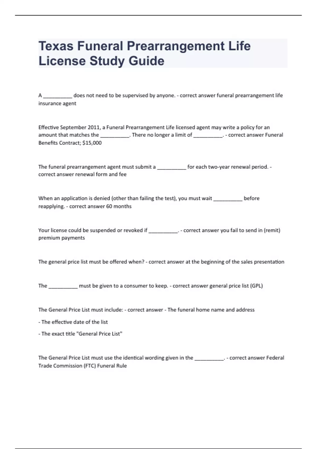 Texas Funeral Prearrangement Life License Study GuideA __________ does not need to be supervised by anyone. - correct answer funeral prearrangement life insurance agent Effective September 2011, a Funeral Prearrangement Life licensed agent may write a policy for an amount that matches the __________. There no longer a limit of __________. - correct answer Funeral Benefits Contract; $15,000 The funeral prearrangement agent must submit a __________ for each two-year renewal period. - correct answer renewal form and fee When an application is denied (other than failing the test), you must wait __________ before reapplying. - correct answer 60 months Your license could be suspended or revoked if __________. - correct answer you fail to send in (remit) premium payments The general price list must be offered when? - correct answer at the beginning of the sales presentation The __________ must be given to a consumer to keep. - correct answer general price list (GPL) The General Price List must include: - correct answer - The funeral home name and address - The effective date of the list - The exact title "General Price List" The General Price List must use the identical wording given in the __________. - correct answer Federal Trade Commission (FTC) Funeral Rule