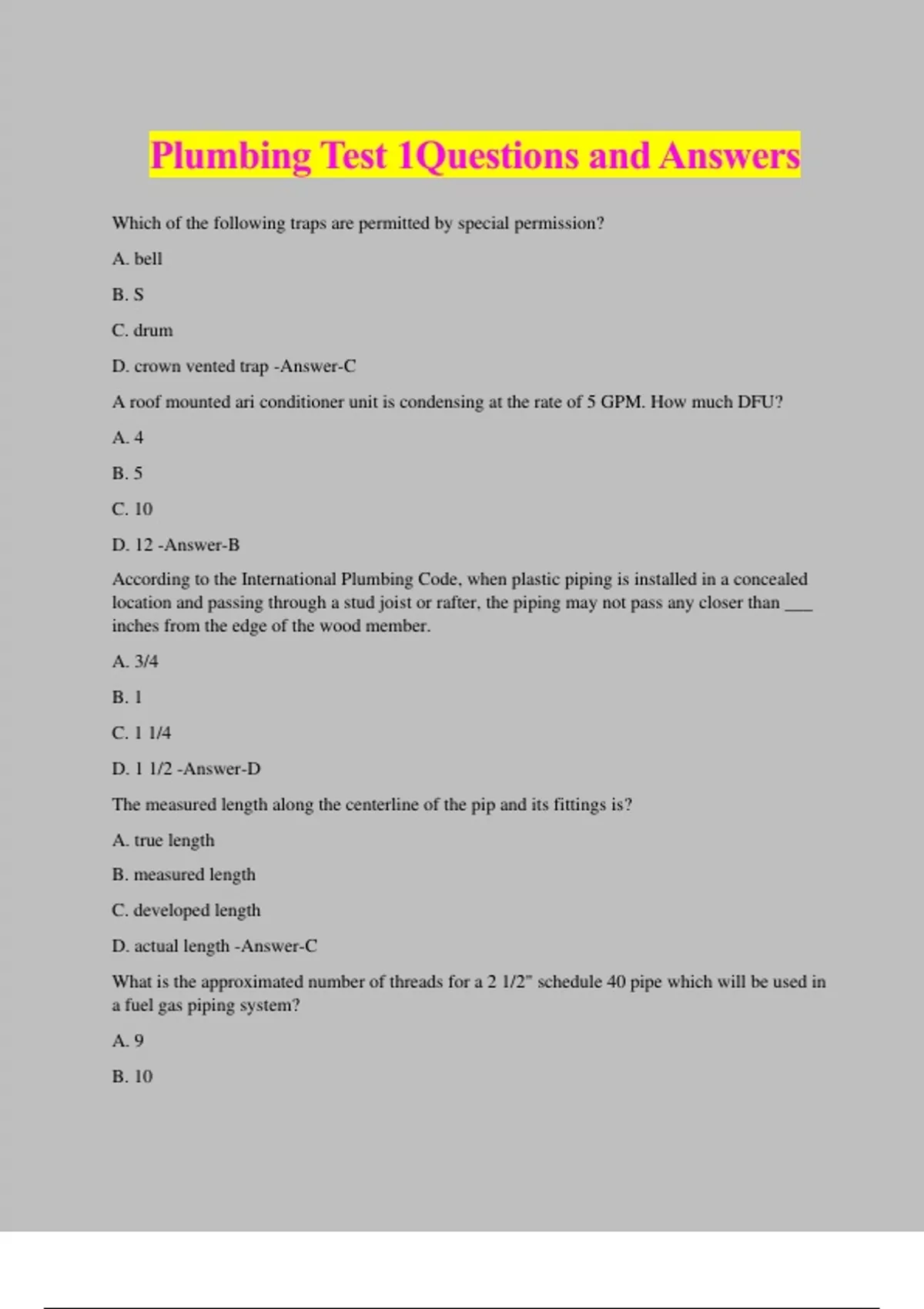 Plumbing Test 1Questions and Answers Which of the following traps are permitted by special permission? A. bell B. S C. drum D. crown vented trap -Answer-C A roof mounted ari conditioner unit is condensing at the rate of 5 GPM. How much DFU? A. 4 B. 5 C. 10 D. 12 -Answer-B According to the International Plumbing Code, when plastic piping is installed in a concealed location and passing through a stud joist or rafter, the piping may not pass any closer than ___ inches from the edge of the wood member. A. 3/4 B. 1 C. 1 1/4 D. 1 1/2 -Answer-D The measured length along the centerline of the pip and its fittings is? A. true length B. measured length C. developed length D. actual length -Answer-C What is the approximated number of threads for a 2 1/2" schedule 40 pipe which will be used in a fuel gas piping system? A. 9 B. 10 C. 11 D. 12 -Answer-D .43 PSI = How many Feet of Head? A. 1 B. 2.31 C. 4.4 D. 43 -Answer-A What is the PSI at the bottom of the drainage pipe if the test for a 4" drainage system is 30' of head? A. 15 psi B. 14 psi C. 13 psi D. 12 psi -Answer-D PSI = feet of head x .433 30 (feet of head) x .433 = 12.99 When gas piping is installed through wood studs and is less than 1 1/4" from the nearest end of the stud, the point of passage shall be protected with a face plate not less than ___. A. 1/32 B. 1/16 C. 3/32 D. 1/8 -Answer-B What is the corresponding feet of head in a sprinkler system whose pressure is 40 PSI? A. 93 B. 112 C. 117 D. 116 -Answer-A Feet of head is 2.31 x PSI 40 x 2.325= 93 A multimeter would test for which of the following? A. current B. CFM C. CFH D. gallons per hour -Answer-A How is the vent from an indirect waste pipe run to the outside? A. separately, unconnected B. within an approved partition C. vertically only D. may be jointed to another vent prior to exiting the roof as long as the joining is above the ceiling -Answer-A If the claim be for the planting of any trees, vines, plants or hedge, the lien must be filed within 4 months of the ___. A. planting B. purchase C. contract signing D. delivery -Answer-A Which of the following codes has been adopted as the plumbing code for Oklahoma? A. UPC B. IPC C. 1997 UPC D. 1997 IPC -Answer-D Which of the following conditions best describes corrosion protection for fuel gas piping which is buried in the ground? I. Protected in an approved manner such as galvanizing. II. Machine wrapped with approved coating. A. I B. II C. Both I & II D. Neither I nor II -Answer-B What is the center line rough in dimension of urinals? A. 36 inches B. 30 inches C. 20 inches D. 24 inches -Answer-B What is the hydrostatic pressure test for a new drainage system? A. 15' of head for 15 minutes B. 10' of head for 15 minutes C. 10' of head for 30 minutes D. 15' of head for 30 minutes -Answer-B How high above a fixture must the critical level (c/l) of the vacuum breaker be? A. 6" B. 4" C. 2" D. 3" -Answer-A Where is the critical level (c/l) on vacuum breaker when there is no marking? A. the top B. the bottom C. 6" above the top D. 6" below the bottom -Answer-B A 3" water main is standing full of water after a pressure test. The guage ready at the base is: A. 23.1 psi B. 28.19 psi C. 42 psi D. 18.05 psi ASSUME the main is standing with 42' of head. -Ans