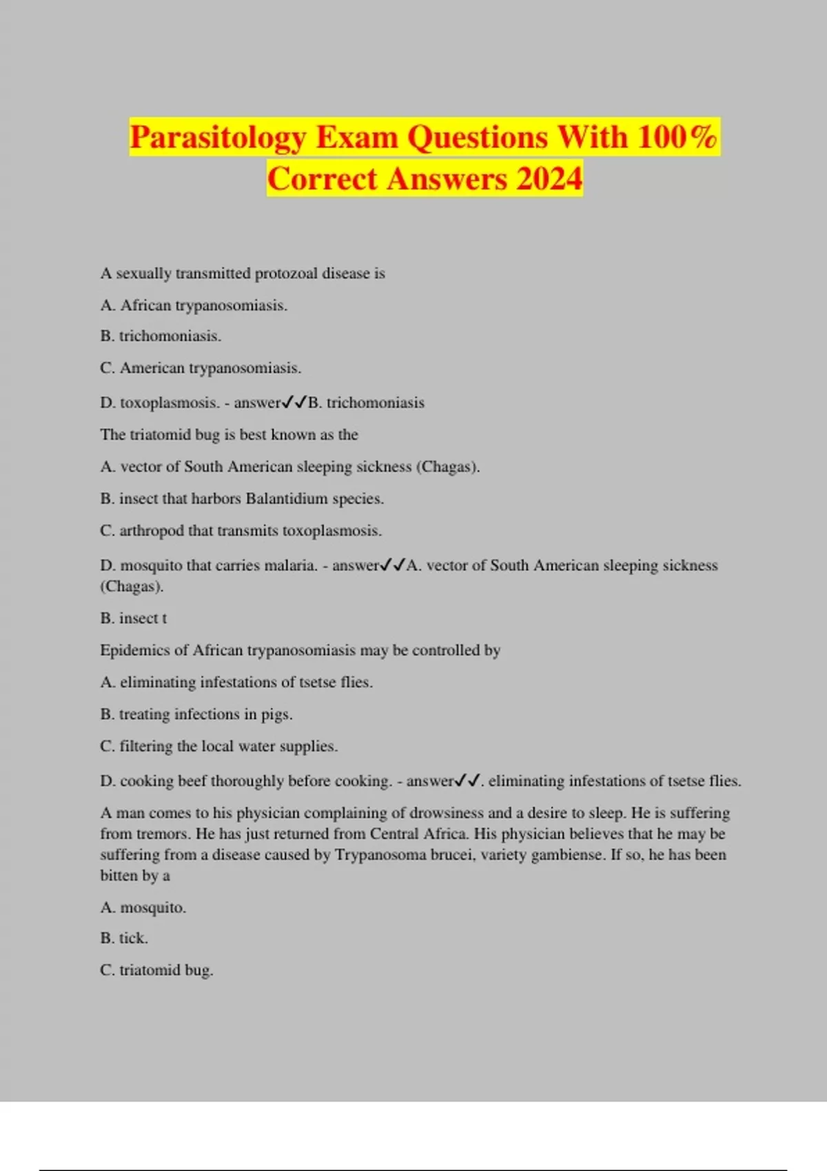 Parasitology Exam Questions With 100% Correct Answers 2024 A sexually transmitted protozoal disease is A. African trypanosomiasis. B. trichomoniasis. C. American trypanosomiasis. D. toxoplasmosis. - answerB. trichomoniasis The triatomid bug is best known as the A. vector of South American sleeping sickness (Chagas). B. insect that harbors Balantidium species. C. arthropod that transmits toxoplasmosis. D. mosquito that carries malaria. - answerA. vector of South American sleeping sickness (Chagas). B. insect t Epidemics of African trypanosomiasis may be controlled by A. eliminating infestations of tsetse flies. B. treating infections in pigs. C. filtering the local water supplies. D. cooking beef thoroughly before cooking. - answer. eliminating infestations of tsetse flies. A man comes to his physician complaining of drowsiness and a desire to sleep. He is suffering from tremors. He has just returned from Central Africa. His physician believes that he may be suffering from a disease caused by Trypanosoma brucei, variety gambiense. If so, he has been bitten by a A. mosquito. B. tick. C. triatomid bug. D. tsetse fly. - answerD. tsetse fly. Two important means for contracting toxoplasmosis are A. inhaling protozoa and an arthropod bite. B. an arthropod bite and consuming rare beef. C. consuming rare beef and contact with a cat. D. contact with a cat and inhaling protozoa. - answerC. consuming rare beef and contact with a cat This protozoan can cause serious problems if a pregnant woman becomes infected. The fetus may become infected because the parasites pass across the placenta. They may cause brain and eye damage, lesions of the visceral organs, or spontaneous abortion. This organism is A. Toxoplasma gondii. B. Trypanosoma brucei. C. Trypanosoma cruzi. D. Trichomonas vaginalis. - answerA. Toxoplasma gondii 42. Which of the following organisms is responsible for the disease called elephantiasis because of the gross swelling of lymphatic tissues? A. Enterobius vermicularis B. Ascaris lumbricoides C. Wuchereria bancrofti D. Trichinella spiralis - answerC. Wuchereria bancrofti 1. The "world's most urgent public he