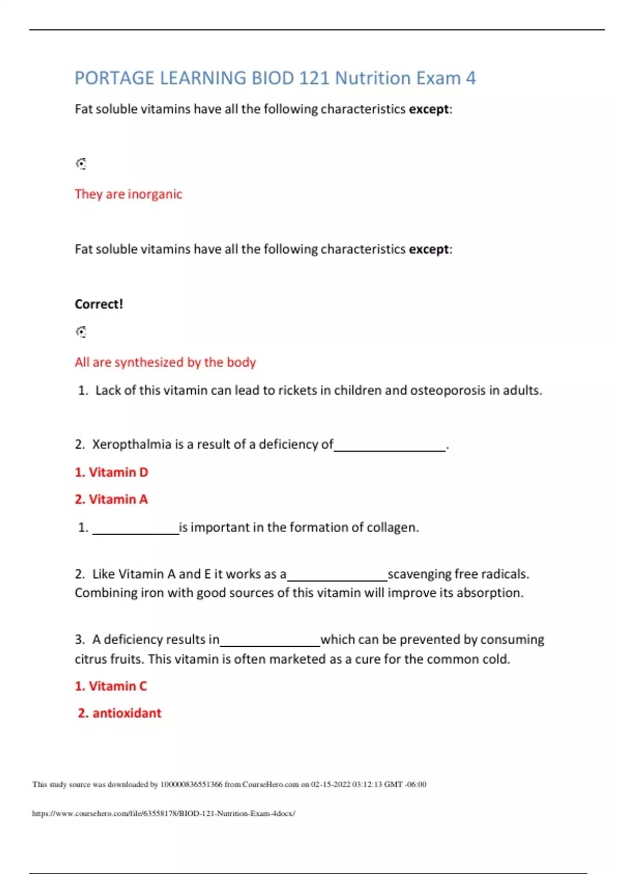 This study source was downloaded by from CourseH on :12:13 GMT -06:00 PORTAGE LEARNING BIOD 121 Nutrition Exam 4 Fatsoluble vitamins have all the following characteristics except: They are inorganic Fatsoluble vitamins have all the following characteristics except: Correct! All are synthesized by the body 1. Lack of this vitamin can lead to rickets in children and osteoporosis in adults. 2. Xeropthalmia is a result of a deficiency of . 1. Vitamin D 2. Vitamin A 1. isimportant in the formation of collagen. 2. Like Vitamin A and E it works as a scavenging free radicals. Combining iron with good sources of this vitamin will improve its absorption. 3. A deficiency results in which can be prevented by consuming citrus fruits. This vitamin is often marketed as a cure for the common cold. 1. Vitamin C 2. antioxidant This study source was downloaded by from CourseH on :12:13 GMT -06:00 3. scurvy 1. What vitamin should a women consider supplementing prior to conception and why? Folate - To prevent neural tube defectsthat occur early in the pregnancy. 1. A deficiency of results in beriberi which translates to I can’t I can’t. Pellagra is a deficiency of niacin and the symptoms include diarrhea, dermatitis, dementia and death. 2. Ariboflavinosis results from a deficiency leading to an inflamed tongue known as glossitis and cheilosis, cracks around the mouth. 3. A deficiency of folate and vitamin both result in megaloblastic anemia, formation of large immature red blood cells. 1. Thiamin 2. Riboflavin 3. B-12 1. To prevent dehydration two hormones are secreted. is secreted from the adrenal glands to conserve sodium and water. 2. The pituitary glands release to decrease urine output. 1. Aldosterone 2. antidiuretic hormone What are ions? Ions are minerals that have an electrical charge and are called electrolytes. This study source was downloaded by from CourseH on :12:13 GMT -06:00 1. Are minerals considered essential or nonessential nutrients? 2. The degree to which they can be absorbed is called their . Minerals needed in amounts > 100 mg per day are called major minerals while those needed in quantities < 100 mg daily are trace minerals. 3. True or False: Minerals are destroyed by heat, light and air during the cooking process? 1. Essential nutrients 2. bioavailability 3. false Name the food sources that are good sources of heme iron. Iron found in animal flesh is in the form of hemoglobin or myoglobin (found in muscle cells) is referred to as heme iron and is easily absorbed. Match the following minerals to their disease/deficiency. a. Iron b. Selenium c. Iodide d. Calcium 1. A particular type of heart disease 2. Osteoporosis 3. Congenital hypothyroidism in children 4. Anemia resulting from a low hematocrit and hemoglobin level This study source was downloaded by from CourseH on :12:13 GMT -06:00 1. A particular type of heart disease 2. Osteoporosis 3. Congenital hypothyroidism in children 4. Anemia resulting from a low hematocrit and hemoglobin level