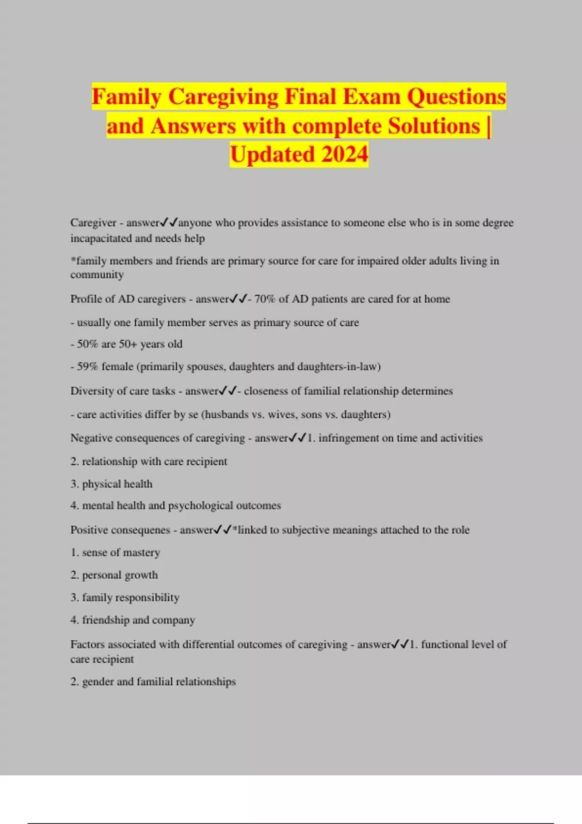 Family Caregiving Final Exam Questions and Answers with complete Solutions | Updated 2024 Caregiver - answeranyone who provides assistance to someone else who is in some degree incapacitated and needs help *family members and friends are primary source for care for impaired older adults living in community Profile of AD caregivers - answer- 70% of AD patients are cared for at home - usually one family member serves as primary source of care - 50% are 50+ years old - 59% female (primarily spouses, daughters and daughters-in-law) Diversity of care tasks - answer- closeness of familial relationship determines - care activities differ by se (husbands vs. wives, sons vs. daughters) Negative consequences of caregiving - answer1. infringement on time and activities 2. relationship with care recipient 3. physical health 4. mental health and psychological outcomes Positive consequenes - answer*linked to subjective meanings attached to the role 1. sense of mastery 2. personal growth 3. family responsibility 4. friendship and company Factors associated with differential outcomes of caregiving - answer1. functional level of care recipient 2. gender and familial relationships 3. ethnicity 4. social support Formal support services - answer- respite servi