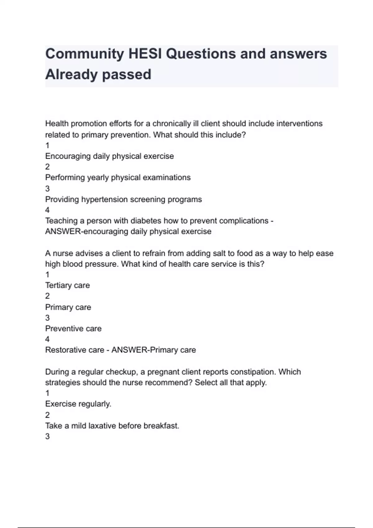 Health promotion efforts for a chronically ill client should include interventions related to primary prevention. What should this include? 1 Encouraging daily physical exercise 2 Performing yearly physical examinations 3 Providing hypertension screening programs 4 Teaching a person with diabetes how to prevent complications - ANSWER-encouraging daily physical exercise A nurse advises a client to refrain from adding salt to food as a way to help ease high blood pressure. What kind of health care service is this? 1 Tertiary care 2 Primary care 3 Preventive care 4 Restorative care - ANSWER-Primary care During a regular checkup, a pregnant client reports constipation. Which strategies should the nurse recommend? Select all that apply. 1 Exercise regularly. 2 Take a mild laxative bef