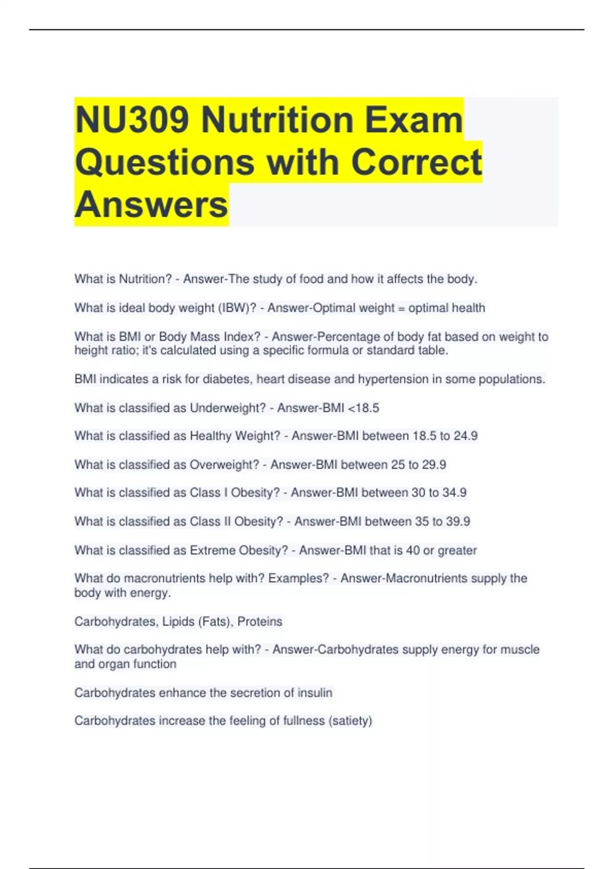 NU309 Nutrition Exam Questions with Correct Answers What is Nutrition? - Answer-The study of food and how it affects the body. What is ideal body weight (IBW)? - Answer-Optimal weight = optimal health What is BMI or Body Mass Index? - Answer-Percentage of body fat based on weight to height ratio; it's calculated using a specific formula or standard table. BMI indicates a risk for diabetes, heart disease and hypertension in some populations. What is classified as Underweight? - Answer-BMI 18.5 What is classified as Healthy Weight? - Answer-BMI between 18.5 to 24.9 What is classified as Overweight? - Answer-BMI between 25 to 29.9 What is classified as Class I Obesity? - Answer-BMI between 30 to 34.9 What is classified as Class II Obesity? - Answer-BMI between 35 to 39.9 What is classified as Extreme Obesity? - Answer-BMI that is 40 or greater What do macronutrients help with? Examples? - Answer-Macronutrients supply the body with energy. Carbohydrates, Lipids (Fats), Proteins What do carbohydrates help with? - Answer-Carbohydrates supply energy for muscle and organ function Carbohydrates enhance the secretion of insulin Carbohydrates increase the feeling of fullness (satiety) How do complex carbs affect the body? - Answer-They digest more slowly, promote fullness, and they raise blood glucose How do simple carbs affect the body? - Answer-They digest quickly, and they raise blood glucose quickly How do proteins affect the body? - Answer-Proteins allow for growth, maintenance, repair of cells and tissue