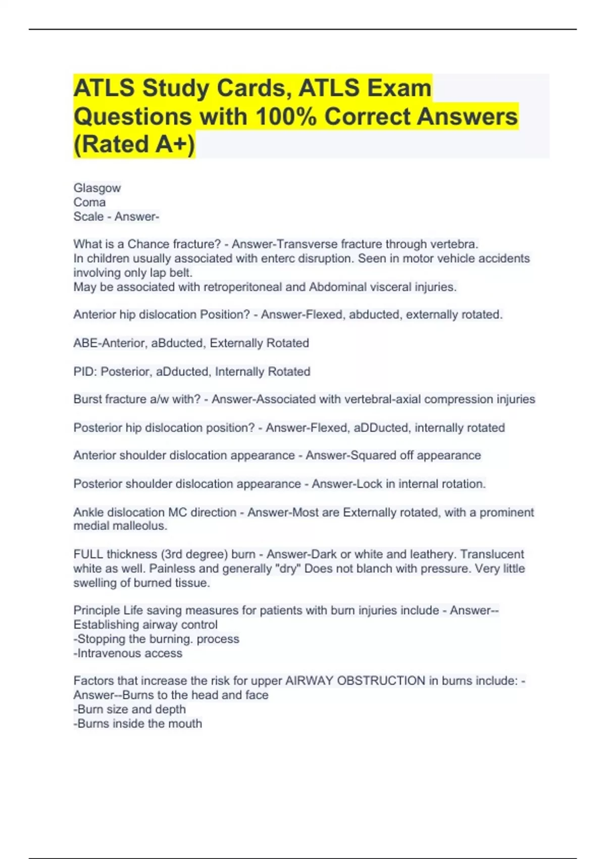 ATLS Study Cards, ATLS Exam Questions with Correct Answers