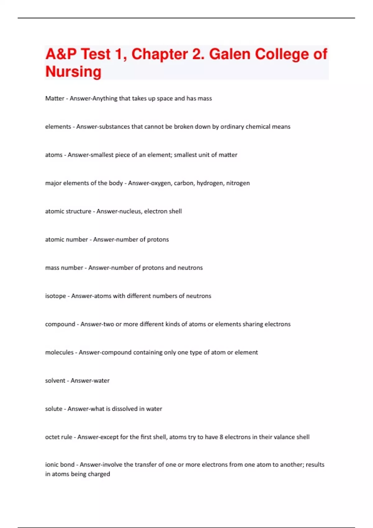 A&P Test 1, Chapter 2. Galen College of Nursing Exam Questions And Answers Rated A+ New Update Assured Satisfaction