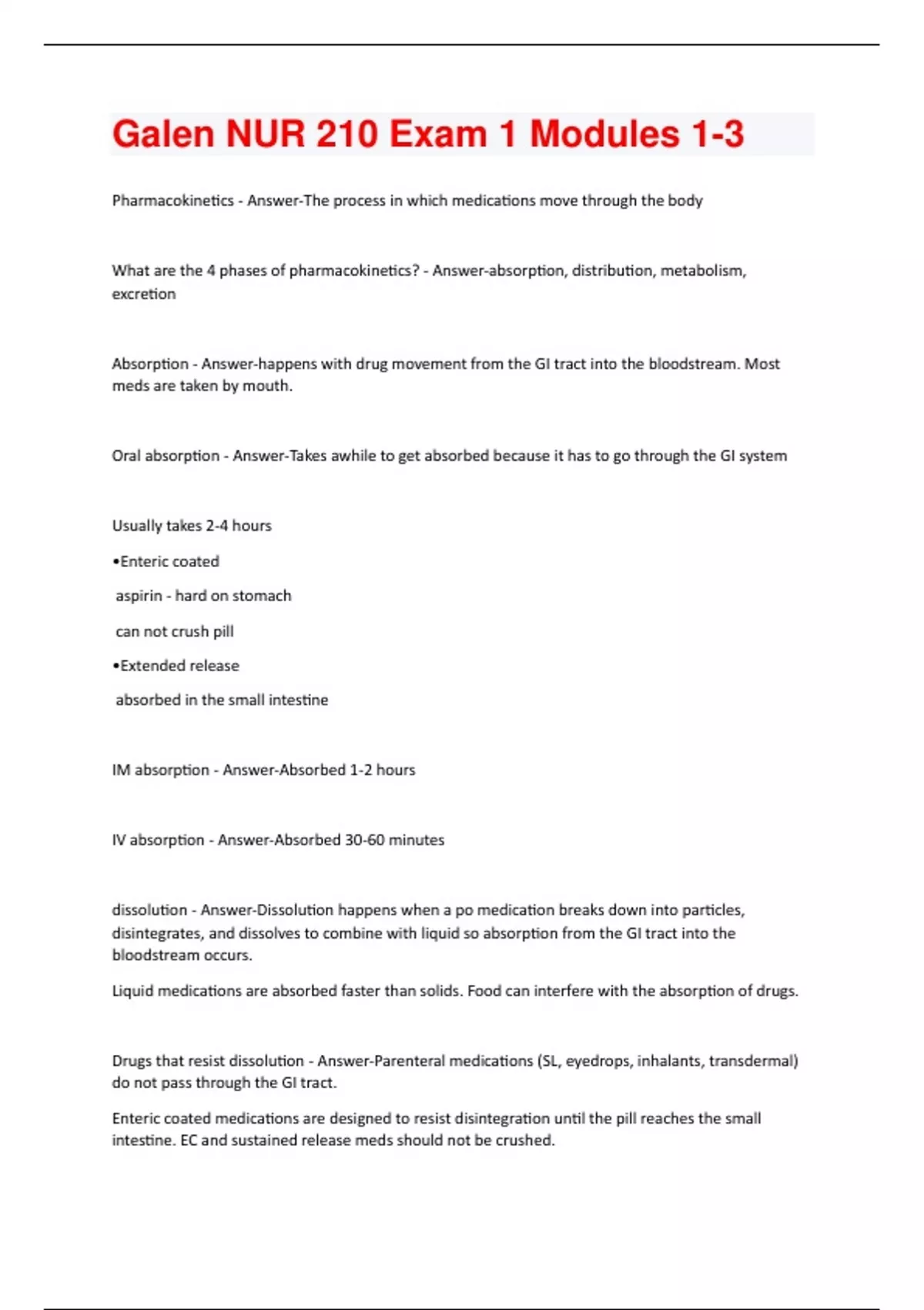 Pharmacokinetics - Answer-The process in which medications move through the body What are the 4 phases of pharmacokinetics? - Answer-absorption, distribution, metabolism, excretion Absorption - Answer-happens with drug movement from the GI tract into the bloodstream. Most meds are taken by mouth. Oral absorption - Answer-Takes awhile to get absorbed because it has to go through the GI system Usually takes 2-4 hours •Enteric coated aspirin - hard on stomach can not crush pill •Extended release absorbed in the small intestine IM absorption - Answer-Absorbed 1-2 hours IV absorption - Answer-Absorbed 30-60 minutes dissolution - Answer-Dissolution happens when a po medication breaks down into particles, disintegrates, and dissolves to combine with liquid so absorption from the GI tract into the bloodstream occurs. Liquid medications are absorbed faster than solids. Food can interfere with the absorption of drugs. Drugs that resist dissolution - Answer-Parenteral medications (SL, eyedrops, inhalants, transdermal) do not pass through the GI tract. Enteric coated medications are designed to resist disintegration until the pill reaches the small intestine. EC and sustained release meds should not be crushed.Factors that affect absorption - Answer-•Lack of muscle and increased fat changes medicine absorption •Food consumption - will change medicine potency (delayed) •Stress - Exercise, medicine goes to muscle •pH - Medicine is made for acidic environments •Antacid changes absorption •Taken alone so it doesn't change the action Excipients - Answer-Fillers and other substances that make up tablets as a pill is not 100% drug. Sometimes an excipient enhances the absorption of a drug such as with PCN, which is not well absorbed from the GI tract. Adding Na to PCN, which makes it penicillin sodium, will increase the absorption of PCN first pass effect - Answer-•the oral drugs go to liver via portal vein where some of the drug becomes inactive •Only happens with oral medications delayed gastric emptying - Answer-Food doesn't move like it should Distribution - Answer-refers to the movement of the drug from the circulation to body tissues Factors affecting distribution - Answer--blood flow to tissues -protein binding -blood brain barrier -drug's affinity to the tissu