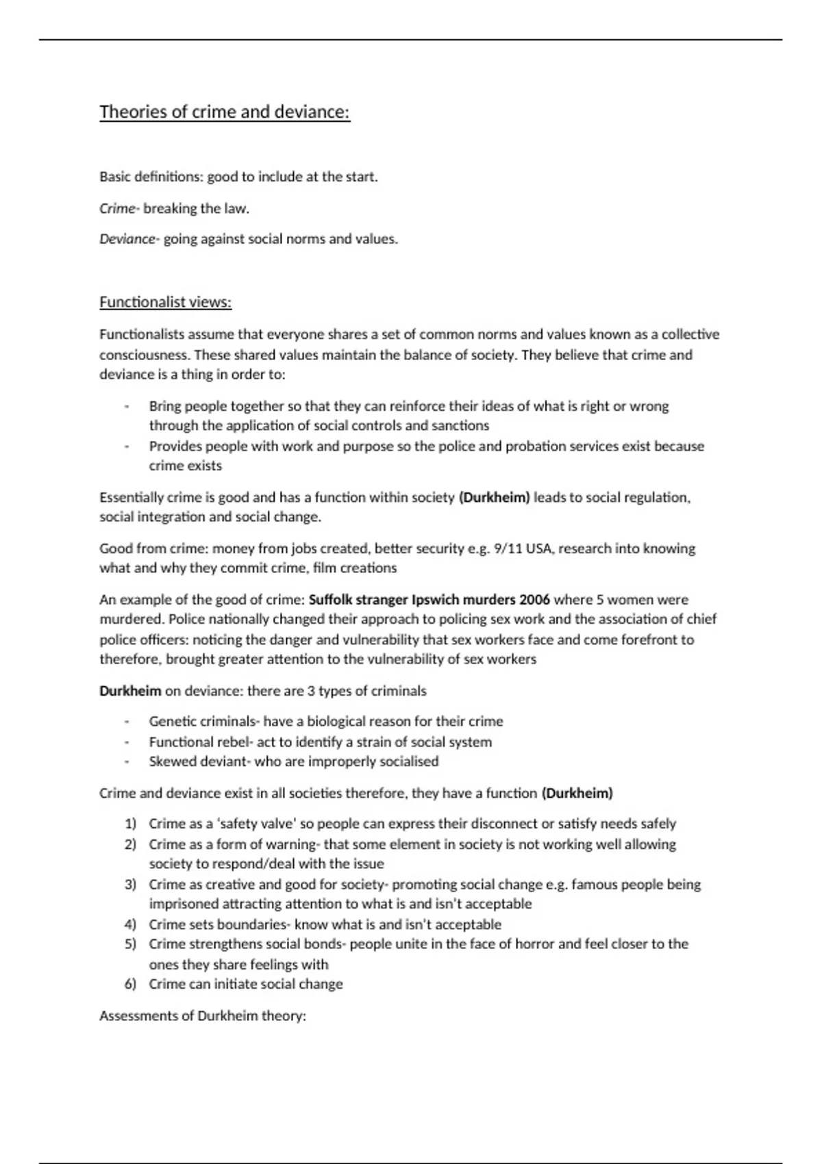 Essentially crime is good and has a function within society (Durkheim) leads to social regulation,