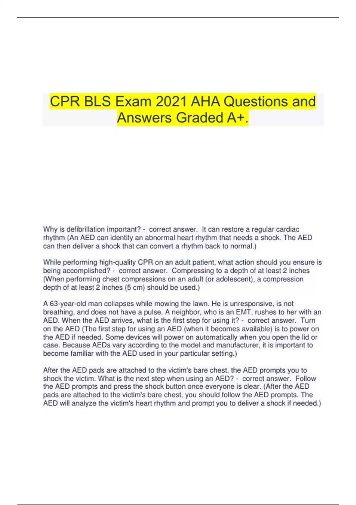CPR BLS Exam 2021 AHA Questions and Answers Graded A+. Why is defibrillation important? - correct answer. It can restore a regular cardiac rhythm (An AED can identify an abnormal heart rhythm that needs a shock. The AED can then deliver a shock that can convert a rhythm back to normal.) While performing high-quality CPR on an adult patient, what action should you ensure is being accomplished? - correct answer. Compressing to a depth of at least 2 inches (When performing chest compressions on an adult (or adolescent), a compression depth of at least 2 inches (5 cm) should be used.) A 63-year-old man collapses while mowing the lawn. He is unresponsive, is not breathing, and does not have a pulse. A neighbor, who is an EMT, rushes to her with an AED. When the AED arrives, what is the first step for using it? - correct answer. Turn on the AED (The first step for using an AED (when it becomes available) is to power on the AED if needed. Some devices will power on automatically when you open the lid or case. Because AEDs vary according to the model and manufacturer, it is important to become familiar with the AED used in your particular setting.) After the AED pads are attached to the victim's bare chest, the AED prompts you to shock the victim. What is the next step when using an AED? - correct answer. Follow the AED prompts and press the shock button once everyone is clear. (After the AED pads are attached to the victim's bare chest, you should follow the AED prompts. The AED will analyze the victim's heart rhythm and prompt you to deliver a shock if needed.) What should you do if you need to use an AED on someone who has been submerged in a pool? - correct answer. Pull the victim out of the water, and wipe the chest, and use the AED (Special situations may require the rescuer to take additional actions when placing AED pads for a victim who is immersed in water. In this case, the victim should be pulled out of the water. If the chest is covered with some water, it should be quickly wiped before attaching the AED pads.) A victim with who is choking becomes unresponsive. What is your first course of action? - correct answer. Start CPR, beginning with chest compressions (Choking victims with severe airway obstruction may worsen and become unresponsive. If this occurs, then high-quality CPR must be started immediately, beginning with chest compressions.) When using a bag-mask device, how can rescuers ensure that they are providing effective breaths? - correct answer. Observing the chest rise with breaths (Squeeze the bag to give breaths (1 second each) while watching for chest rise. Deliver each breath over 1 second, with or without supplementary oxygen.) What ratio for compressions to breaths should be used for 1-rescuer infant CPR? - correct answer. 30 compressions to 2 breaths (For 1-rescuer infant CPR, the correct compression-to-ventilation ratio is 30:2.) What is a consideration when you are using an AED? - correct answer. On a hairy chest, the pads may not stick and may fail to deliver a shock, therefore a razor should be used to shave the victim (Special situations may require the rescuer to take additional actions when placing AED pads on a victim who has a hairy chest. In this case, the AED pads may stick to the hair and not to the skin on the chest, making it difficult to analyze the victim's heart rhythm and deliver a shock (if needed). Most AED kits contain a razor for this reason.) A 7-year-old child has suddenly collapsed. After confirming that the scene is safe, a single rescuer determines that the child is in cardiac arrest, shouts for nearby help, and calls 911. The rescuer immediately begins CPR. Two additional rescuers arrive to assist in the resuscitation attempt. What actions should occur next, to support a team-based resuscitation attempt? - correct answer. 2 rescuers alternate giving high-quality chest compressions (To reduce rescuer fatigue, switch compressors every 5 cycles (about 2 minutes) or sooner if needed. To minimize interruptions in compressions, perform the switch when the AED is analyzing the rhythm. Take less than 5 seconds to switch.) Two rescuers begin CPR while the third rescuer leaves to get the AED. What action supports 2-rescuer CPR? - correct answer. Alternating the compressor role every 2 minutes (To reduce rescuer fatigue, switch compressors every 5 cycles (about 2 minutes) or sooner if needed. To minimize interruptions in compressions, perform the switch when the AED is analyzing the rhythm. Take less than 5 seconds to switch.) You witness a friend suddenly collapse at work. The person is unresponsive, you hear gasping sounds, and there is no pulse. What should you do next? - correct answer.