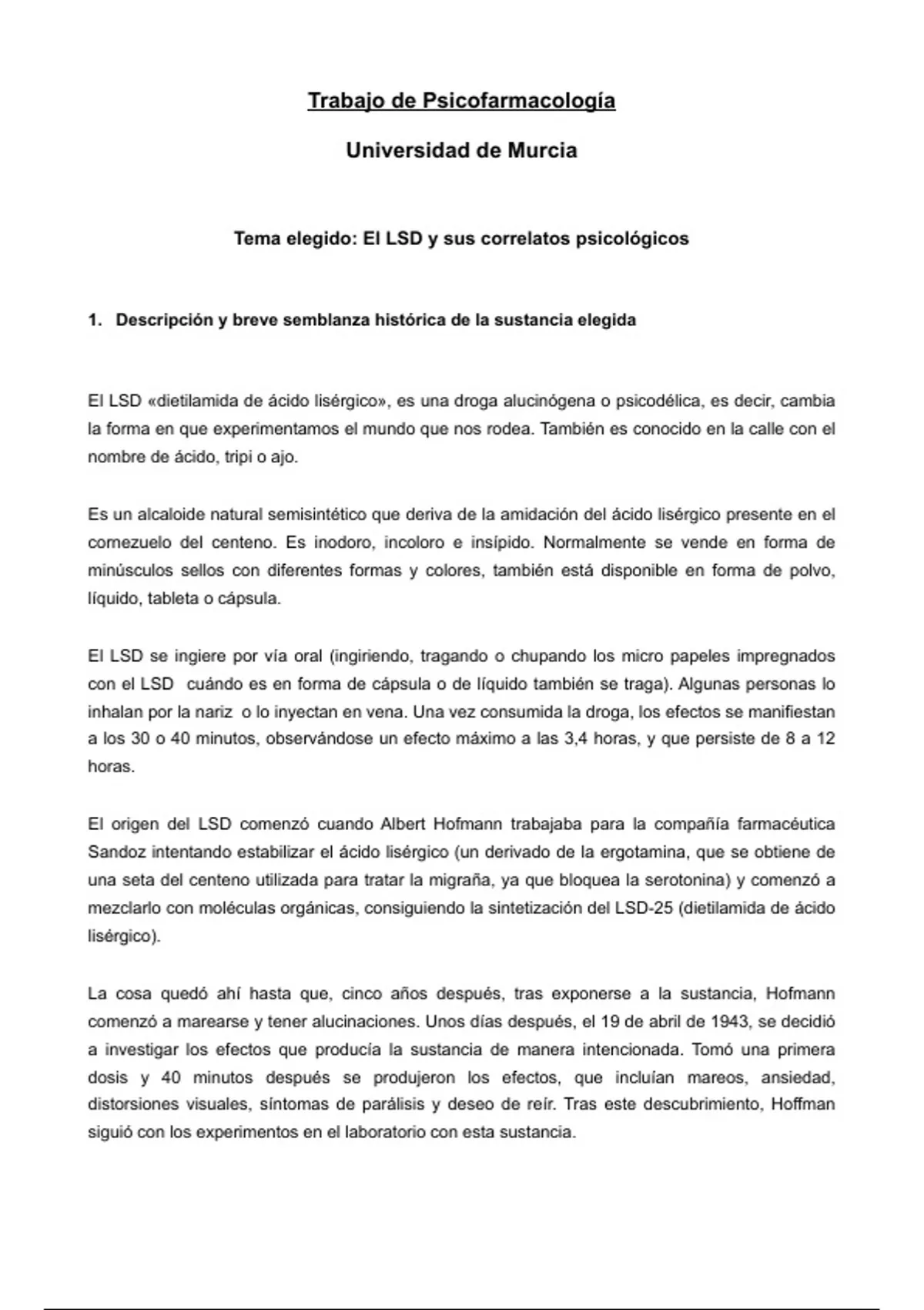 Tema elegido: El LSD y sus correlatos psicológicos