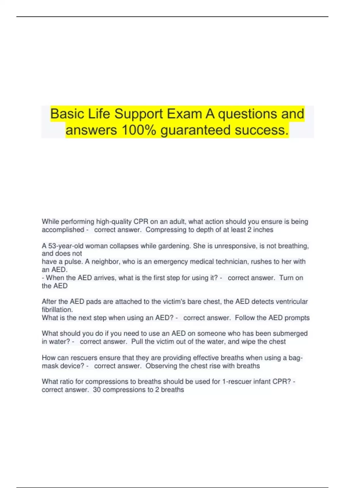 Basic Life Support Exam A questions and answers 100% guaranteed success. While performing high-quality CPR on an adult, what action should you ensure is being accomplished - correct answer. Compressing to depth of at least 2 inches A 53-year-old woman collapses while gardening. She is unresponsive, is not breathing, and does not have a pulse. A neighbor, who is an emergency medical technician, rushes to her with an AED. - When the AED arrives, what is the first step for using it? - correct answer. Turn on the AED After the AED pads are attached to the victim's bare chest, the AED detects ventricular fibrillation. What is the next step when using an AED? - correct answer. Follow the AED prompts What should you do if you need to use an AED on someone who has been submerged in water? - correct answer. Pull the victim out of the water, and wipe the chest How can rescuers ensure that they are providing effective breaths when using a bag-mask device? - correct answer. Observing the chest rise with breaths What ratio for compressions to breaths should be used for 1-rescuer infant CPR? - correct answer. 30 compressions to 2 breaths