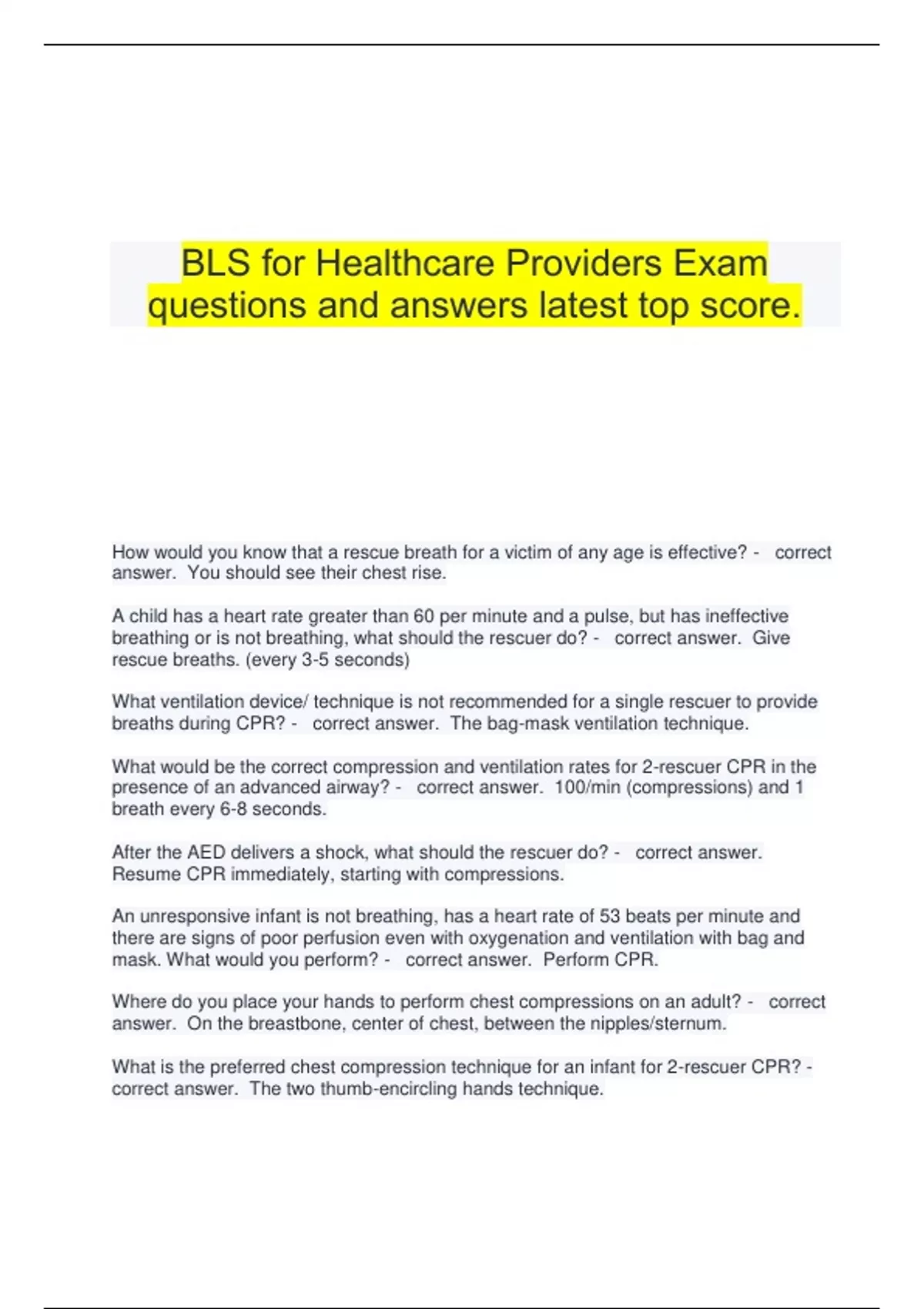 BLS for Healthcare Providers Exam questions and answers latest top score. How would you know that a rescue breath for a victim of any age is effective? - correct answer. You should see their chest rise. A child has a heart rate greater than 60 per minute and a pulse, but has ineffective breathing or is not breathing, what should the rescuer do? - correct answer. Give rescue breaths. (every 3-5 seconds) What ventilation device/ technique is not recommended for a single rescuer to provide breaths during CPR? - correct answer. The bag-mask ventilation technique. What would be the correct compression and ventilation rates for 2-rescuer CPR in the presence of an advanced airway? - correct answer. 100/min (compressions) and 1 breath every 6-8 seconds. After the AED delivers a shock, what should the rescuer do? - correct answer. Resume CPR immediately, starting with compressions. An unresponsive infant is not breathing, has a heart rate of 53 beats per minute and there are signs of poor perfusion even with oxygenation and ventilation with bag and mask. What would you perform? - correct answer. Perform CPR. Where do you place your hands to perform chest compressions on an adult? - correct answer. On the breastbone, center of chest, between the nipples/sternum. What is the preferred chest compression technique for an infant for 2-rescuer CPR? - correct answer. The two thumb-encircling hands technique.