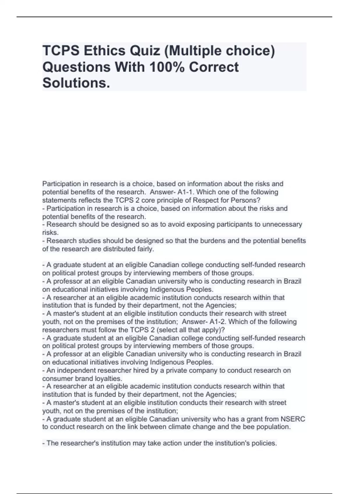 TCPS Ethics Quiz (Multiple choice) Questions With 100% Correct Solutions.