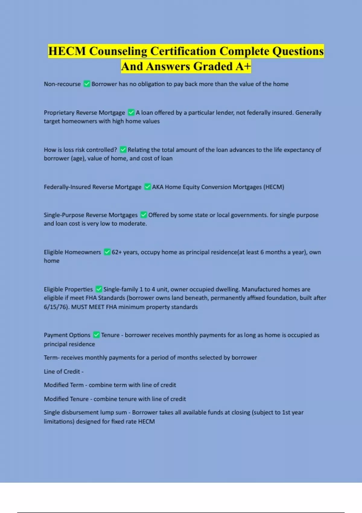 HECM Counseling Certification Complete Questions And Answers Graded A+ HECM Counseling Certification Complete Questions And Answers Graded A+