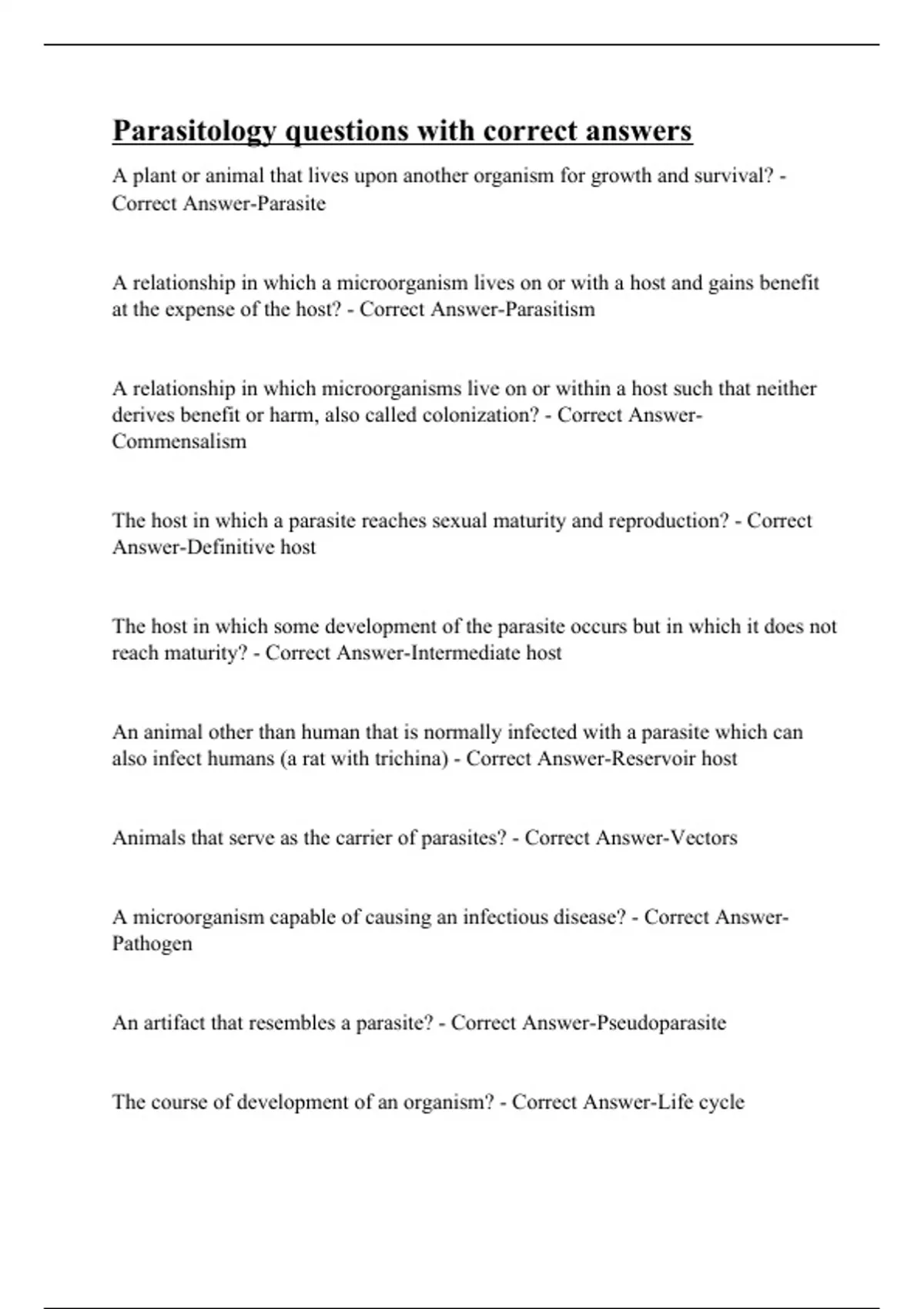 A plant or animal that lives upon another organism for growth and survival? - Correct Answer-Parasite A relationship in which a microorganism lives on or with a host and gains benefit at the expense of the host? - Correct Answer-Parasitism A relationship in which microorganisms live on or within a host such that neither derives benefit or harm, also called colonization? - Correct Answer-Commensalism The host in which a parasite reaches sexual maturity and reproduction? - Correct Answer-Definitive host The host in which some development of the parasite occurs but in which it does not reach maturity? - Correct Answer-Intermediate host An animal other than human that is normally infected with a parasite which can also infect humans (a rat with trichina) - Correct Answer-Reservoir host Animals that serve as the carrier of parasites? - Correct Answer-Vectors A microorganism capable of causing an infectious disease? - Correct Answer-Pathogen An artifact that resembles a parasite? - Correct Answer-Pseudoparasite