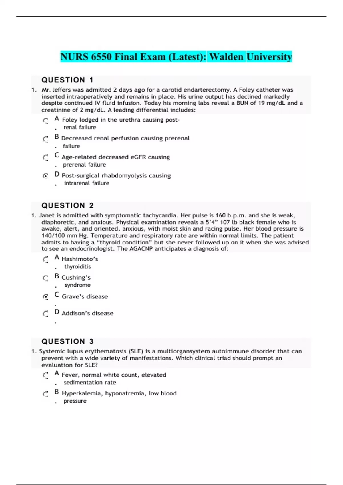 NURS 6550 Final Exam (Latest): Walden University A Foley lodged in the urethra causing post- . renal failure B Decreased renal perfusion causing prerenal . failure C Age-related decreased eGFR causing . prerenal failure D Post-surgical rhabdomyolysis causing . intrarenal failure A Hashimoto’s . thyroiditis B Cushing’s . syndrome C Grave’s disease . D Addison’s disease . A Fever, normal white count, elevated . sedimentation rate B Hyperkalemia, hyponatremia, low blood . pressure C Leukocytosis, hyperglycemia, hypokalemia . D Joint pain, rash, fever . A Meclizine . B Diazepam . C Bed rest . D Epley’s . maneuvers A Osteoarthritis . B Drug or alcohol . toxicity C Hypotension . D Urosepsis . NURS 6550N Final Exam (Latest): Walden University