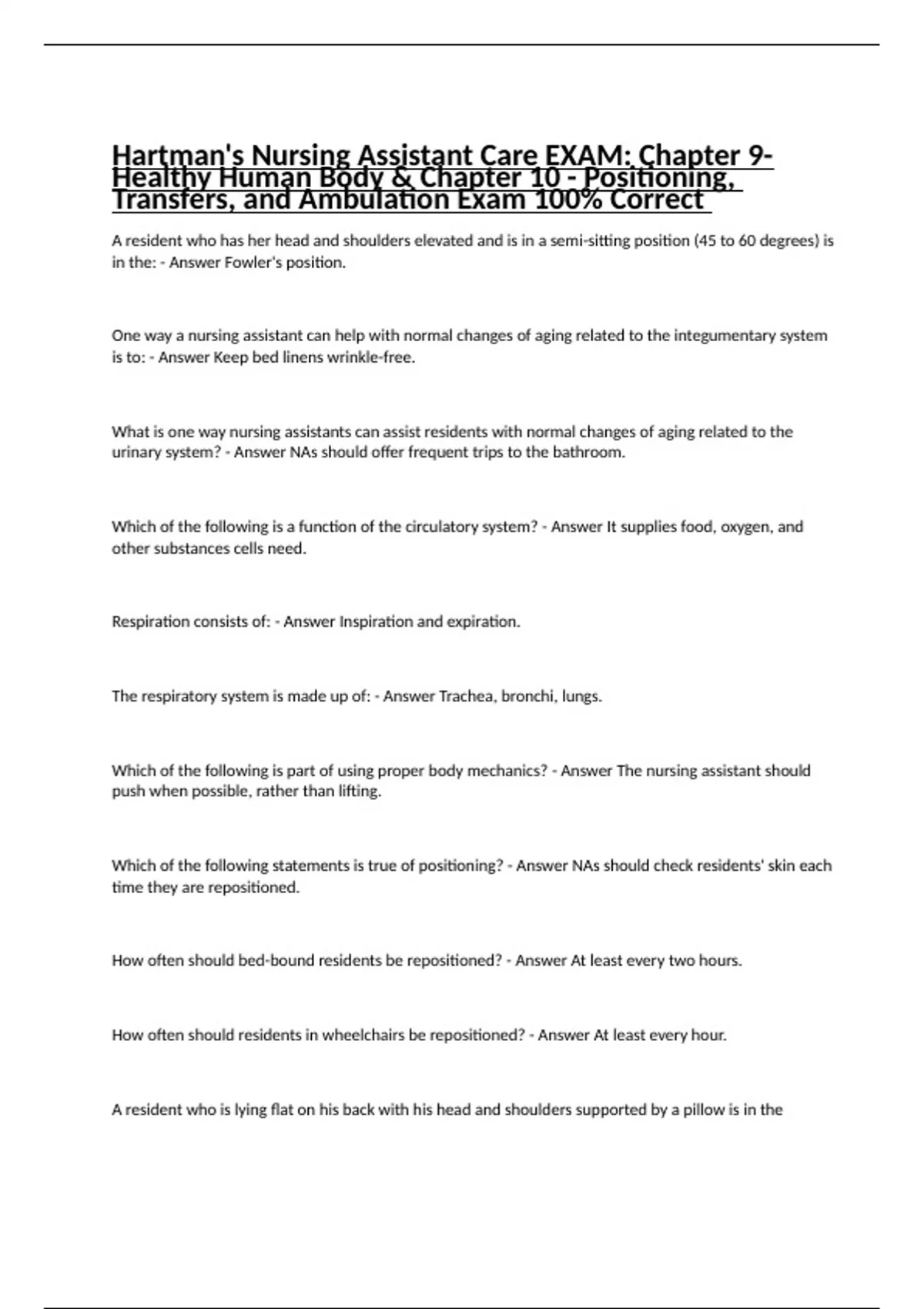 Hartman's Nursing Assistant Care EXAM: Chapter 9-Healthy Human Body & Chapter 10 - Positioning, Transfers, and Ambulation Exam 100% Correct