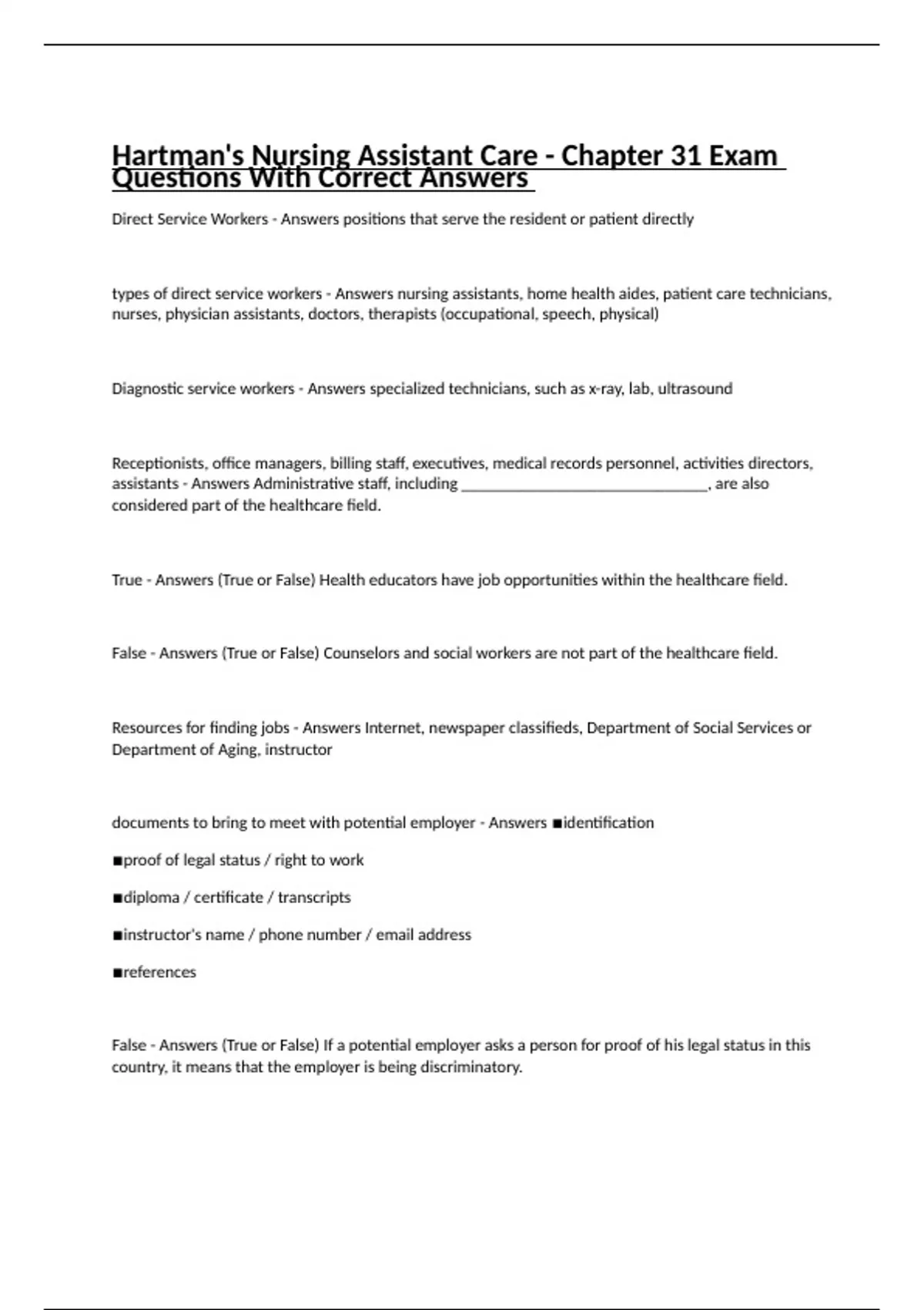 Direct Service Workers - Answers positions that serve the resident or patient directly types of direct service workers - Answers nursing assistants, home health aides, patient care technicians, nurses, physician assistants, doctors, therapists (occupational, speech, physical) Diagnostic service workers - Answers specialized technicians, such as x-ray, lab, ultrasound Receptionists, office managers, billing staff, executives, medical records personnel, activities directors, assistants - Answers Administrative staff, including _____________________________, are also considered part of the healthcare field. True - Answers (True or False) Health educators have job opportunities within the healthcare field. False - Answers (True or False) Counselors and social workers are not part of the healthcare field. Resources for finding jobs - Answers Internet, newspaper classifieds, Department of Social Services or Department of Aging, instructor documents to bring to meet with potential employer - Answers ▪︎identification ▪︎proof of legal status / right to work ▪︎diploma / certificate / transcripts ▪︎instructor's name / phone number / email address ▪︎references False - Answers (True or False) If a potential employer asks a person for proof of his legal status in this country, it means that the employer is being discriminatory. former employers and teachers - Answers ____________________________________________ are the best references to use for a potential job. resume - Answers summary or listing of relevant job experience and education one page - Answers A resume should fit on ____________________. educational and work - Answers A resume should include a list of ___________________ and ___________ experience, as well as special skills, professional organizations, and volunteer work. skills - Answers A cover letter should emphasize the ___________ that would be a good match for the position a person is seeking. position you are seeking and why you would be the best person - Answers a cover letter should briefly state _________________________. things to include in a cover letter - Answers ▪︎date ▪︎name, address, phone, email ▪︎recipient's name, job title, address ▪︎salutation ▪︎introduction (position you are seeking) ▪︎body (skills/experience) ▪︎closing and signature things to include on a job application - Answers ▪︎your address, phone number, email address ▪︎birth date ▪︎social security number ▪︎name / address of school ▪︎previous employers / salary information ▪︎reasons why you left ▪︎references - names, addresses, phone numbers, email addresses ▪︎days and hours available to work ▪︎brief statement about why you are changing jobs
