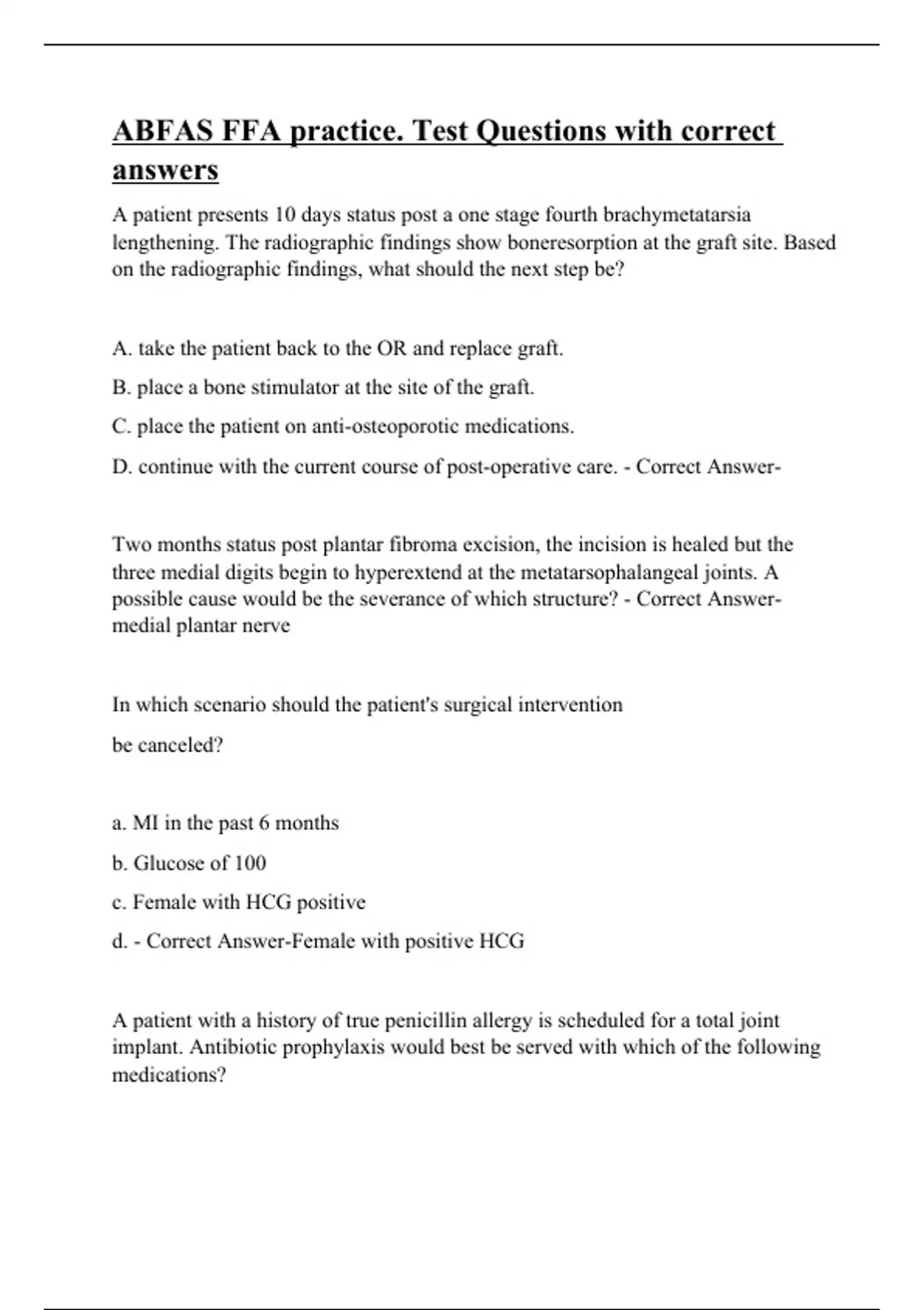 A patient presents 10 days status post a one stage fourth brachymetatarsia lengthening. The radiographic findings show boneresorption at the graft site. Based on the radiographic findings, what should the next step be? A. take the patient back to the OR and replace graft. B. place a bone stimulator at the site of the graft. C. place the patient on anti-osteoporotic medications. D. continue with the current course of post-operative care. - Correct Answer- Two months status post plantar fibroma excision, the incision is healed but the three medial digits begin to hyperextend at the metatarsophalangeal joints. A possible cause would be the severance of which structure? - Correct Answer-medial plantar nerve In which scenario should the patient's surgical intervention be canceled? a. MI in the past 6 months b. Glucose of 100 c. Female with HCG positive d. - Correct Answer-Female w