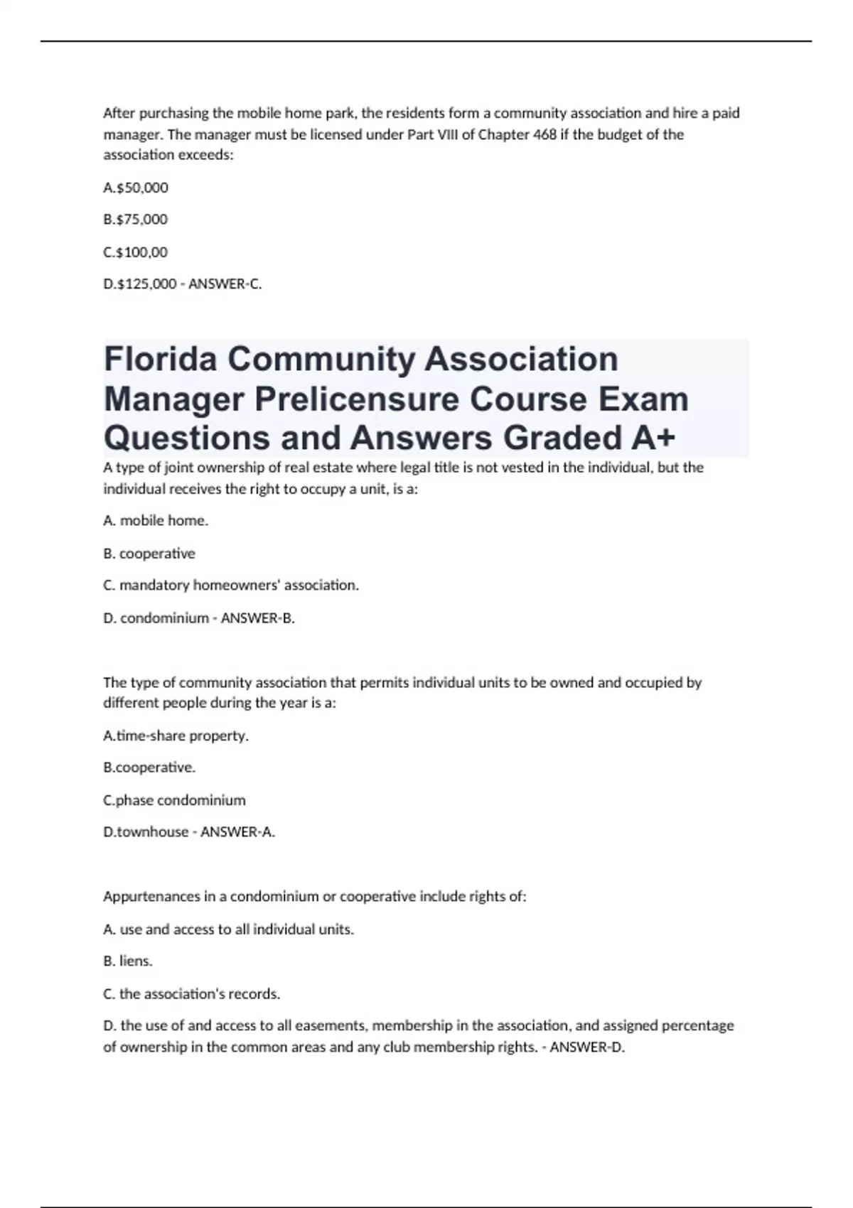 A type of joint ownership of real estate where legal title is not vested in the individual, but the individual receives the right to occupy a unit, is a: A. mobile home. B. cooperative C. mandatory homeowners' association. D. condominium - ANSWER-B. The type of community association that permits individual units to be owned and occupied by different people during the year is a: A.time-share property. B.cooperative. C.phase condominium D.townhouse - ANSWER-A. Appurtenances in a condominium or cooperative include rights of: A. use and access to all individual units. B. liens. C. the association's records. D. the use of and access to all easements, membership in the association, and assigned percentage of ownership in the common areas and any club membership rights. - ANSWER-D. Any person or firm licensed under Part VIII of Chapter 468, Florida Statutes, is considered: