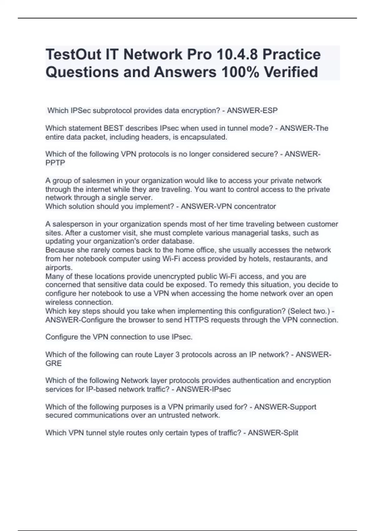 TestOut IT Network Pro 10.4.8 Practice Questions and Answers 100% VerifiedTestOut IT Network Pro 10.4.8 Practice Questions and Answers 100% VerifiedTestOut IT Network Pro 10.4.8 Practice Questions and Answers 100% Verified Which IPSec subprotocol provides data encryption? - ANSWER-ESP Which statement BEST describes IPsec when used in tunnel mode? - ANSWER-The entire data packet, including headers, is encapsulated. Which of the following VPN protocols is no longer considered secure? - ANSWER-