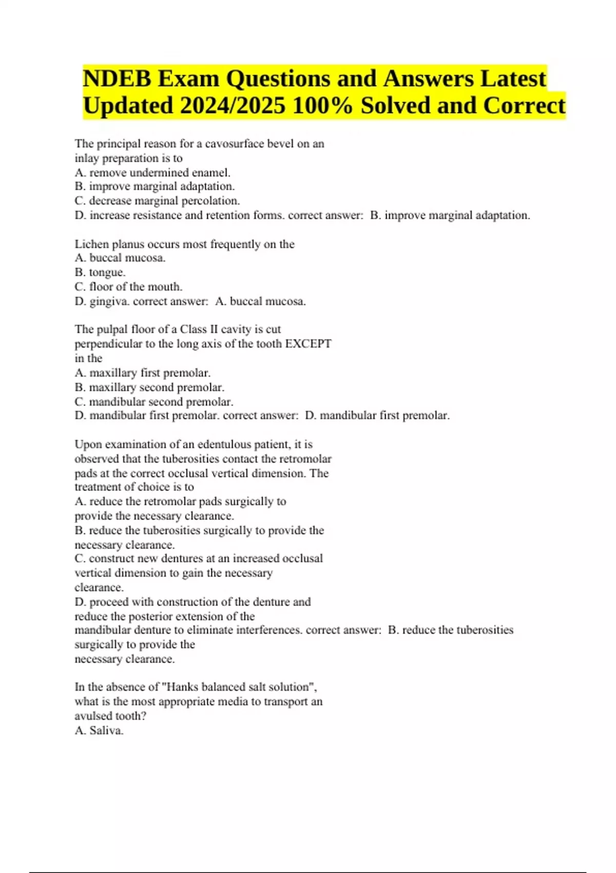 NDEB Exam Questions and Answers Latest Updated 2024/2025 (100% Solved) The principal reason for a cavosurface bevel on an inlay preparation is to A. remove undermined enamel. B. improve marginal adaptation. C. decrease marginal percolation. D. increase resistance and retention forms. correct answer: B. improve marginal adaptation. Lichen planus occurs most frequently on the A. buccal mucosa. B. tongue. C. floor of the mouth. D. gingiva. correct answer: A. buccal mucosa. The pulpal floor of a Class II cavity is cut perpendicular to the long axis of the tooth EXCEPT in the A. maxillary first premolar. B. maxillary second premolar. C. mandibular second premolar. D. mandibular first premolar. correct answer: D. mandibular first premolar. Upon examination of an edentulous patient, it is observed that the tuberosities contact the retromolar pads at the correct occlusal vertical dimension. The treatment of choice is to A. reduce the retromolar pads surgically to provide the necessary clearance. B. reduce the tuberosities surgically to provide the necessary clearance. C. construct new dentures at an increased occlusal vertical dimension to gain the necessary clearance. D. proceed with construction of the denture and reduce the posterior extension of the mandibular denture to eliminate interferences. correct answer: B. reduce the tuberosities surgically to provide the necessary clearance. In the absence of "Hanks balanced salt solution", what is the most appropriate media to transport an avulsed tooth? A. Saliva. NDEB Exam Questions and Answers Latest Updated 2024/2025 100% Solved and Correct B. Milk. C. Saline. D. Tap water. correct answer: B. Milk. The setting of a zinc-phosphate cement can best be retarded by A. decreasing the particle size. B. increasing the concentration of water in the liquid. C. increasing the rate of addition of the powder to the liquid. D. cooling the glass mixing slab. correct answer: D. cooling the glass mixing slab. What is the most likely diagnosis of a white lesion on the retromolar pad opposing a non-functional molar? A. Alveolar ridge keratosis. B. Candidiasis. C. Lichen planus. D. Squamous cell carcinoma correct answer: A. Alveolar ridge keratosis Which of the following is the most likely cause of osteoporosis, glaucoma, hypertension and peptic ulcers in a 65 year old with Crohn's disease? A. Uncontrolled diabetes. B. Systemic corticosteroid therapy. C. Chronic renal failure. D. Prolonged NSAID therapy. E. Malabsorption syndrome. correct answer: B. Systemic corticosteroid therapy. A hinge axis facebow records A. Bennett angle. B. centric relation. C. lateral condylar inclination. D. horizontal condylar inclination. E. opening and closing axis of the mandible. correct answer: E. opening and closing axis of the mandible. The most important objective of occlusal adjustment of a natural dentition is to A. prevent temporomandibular joint syndrome. B. increase the shearing action in mastication. C. improve oral hygiene by preventing food impaction. D. achieve a more favorable direction and distribution of forces of occlusion. correct answer: D. achieve a more favorable direction and distribution of forces of occlusion. Which condition has NOT been associated with Candida albicans infection? A. Median rhomboid glossitis. B. Angular cheilitis. C. Denture stomatitis. D. Aphthous ulcerations. E. Oral hairy leukoplakia. correct answer: D. Aphthous ulcerations. Which of the following is essential for successful periodontal treatment? A. Scaling. B. Final evaluation and maintenance on a oneyear recall. C. Periodontal flap surgery. D. Elimination of local etiologic factors. correct answer: D. Elimination of local etiologic factors. If a complete mandibular denture causes a burning sensation in the premolar region, this is due to the denture exerting pressure in/on the A. fibres of the buccinator muscle. B. lingual branch of the mandibular division of the trigeminal nerve. C. underlying bone. D. mental branch of the inferior alveolar nerve. E. buccal frenum area. correct answer: D. mental branch of the inferior alveolar nerve. A hinge axis facebow records A. Bennett angle. B. centric relation. C. lateral condylar inclination. D. horizontal condylar inclination. E. opening and closing axis of the mandible. correct answer: E. opening and closing axis of the mandible. Which of the following microorganisms are most frequently found in infected root canals? A. Streptococcus viridans. B. Staphylococcus aureus. C. Lactobacilli. D. Enterococci. E. Staphylococcus albus. correct answer: A. Streptococcus viridans. The predominant type of movement produced by a finger spring on a removable appliance is A. torque. B. tipping. C. rotation. D. translation. correct answer: B. tipping. Epinephrine should be administered immediately in which of the following emergencies? A. A severe angina attack. B. A mild asthmatic attack. C. Severe anaphylaxis. D. Severe hypotension correct answer: C. Severe anaphylaxis. The location and extent of subgingival calculus is most accurately determined clinically by A. radiopaque solution used in conjunction with radiographs. B. disclosing solution. C. probing with a fine instrument. D. visual inspection correct answer: C. probing with a fine instrument. Endotoxin is A. a cell wall component of gram-negative bacteria. B. a potent inflammatory agent. C. present in diseased root cementum. D. All of the above. correct answer: D. All of the above. In inhalation analgesia, what is the safe maximal nitrous oxide concentration that can be delivered? A. 50%. B. 60%. C. 70%. D. 80%. correct answer: C. 70%. The bond between porcelain and metal in a ceramometal (porcelain bonded to metal) crown is A. chemical. B. mechanical. C. equally chemical and mechanical. D. neither chemical nor mechanical. correct answer: A. chemical. The predominant immunoglobulin isolated from saliva is A. IgG. B. IgM. C. IgA. D. IgD. correct answer: C. IgA. Soft tissue pockets CANNOT be reduced by A